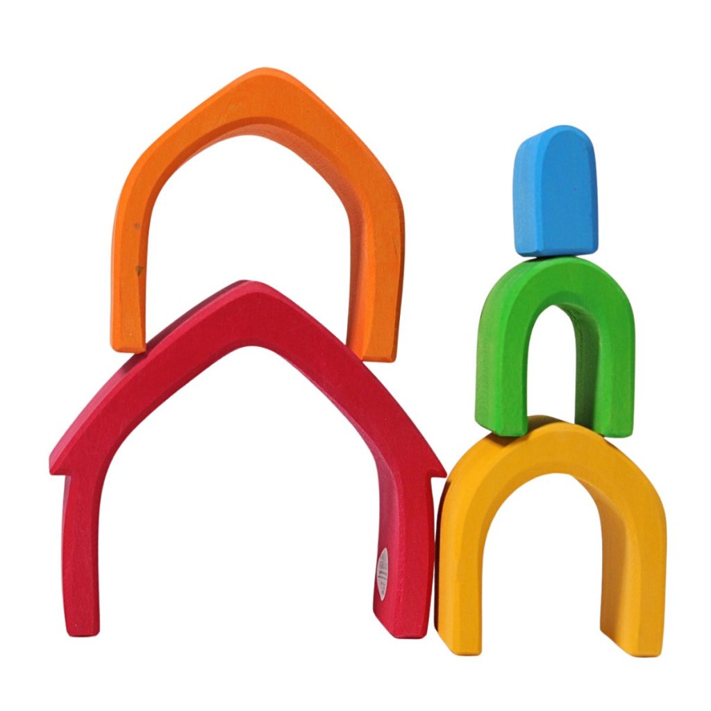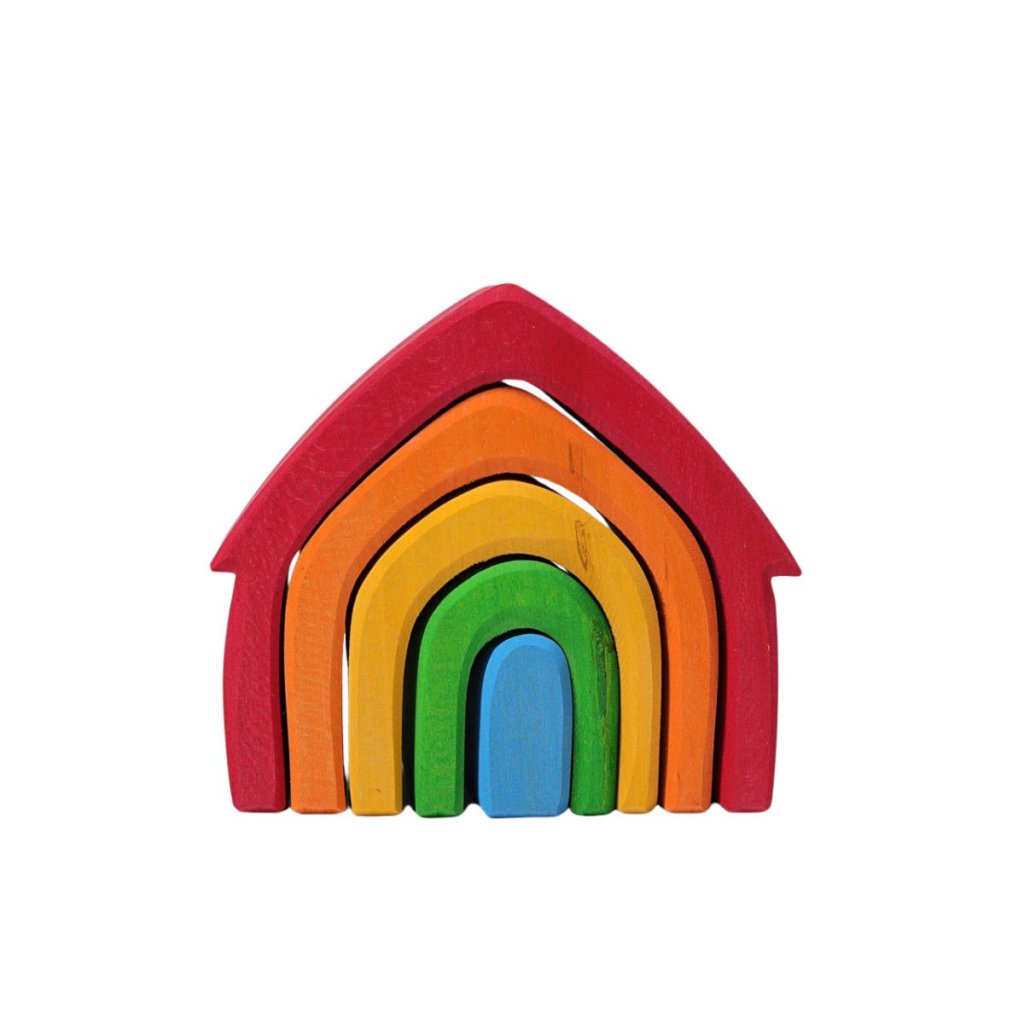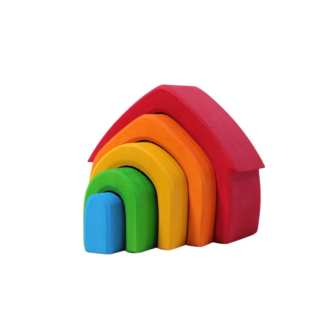 Duhový domek se skládá z pěti dřevěných dílů. Nejmenším dětem poskytne zábavu jako skládačka a starší děti mohou postavit ohrádky pro zvířátka, kolébky pro panenky nebo je využijí v kombinaci s kostkami a vystaví z nich městečko. Skvěle se vnich zabydlí také duhoví přátelé.
