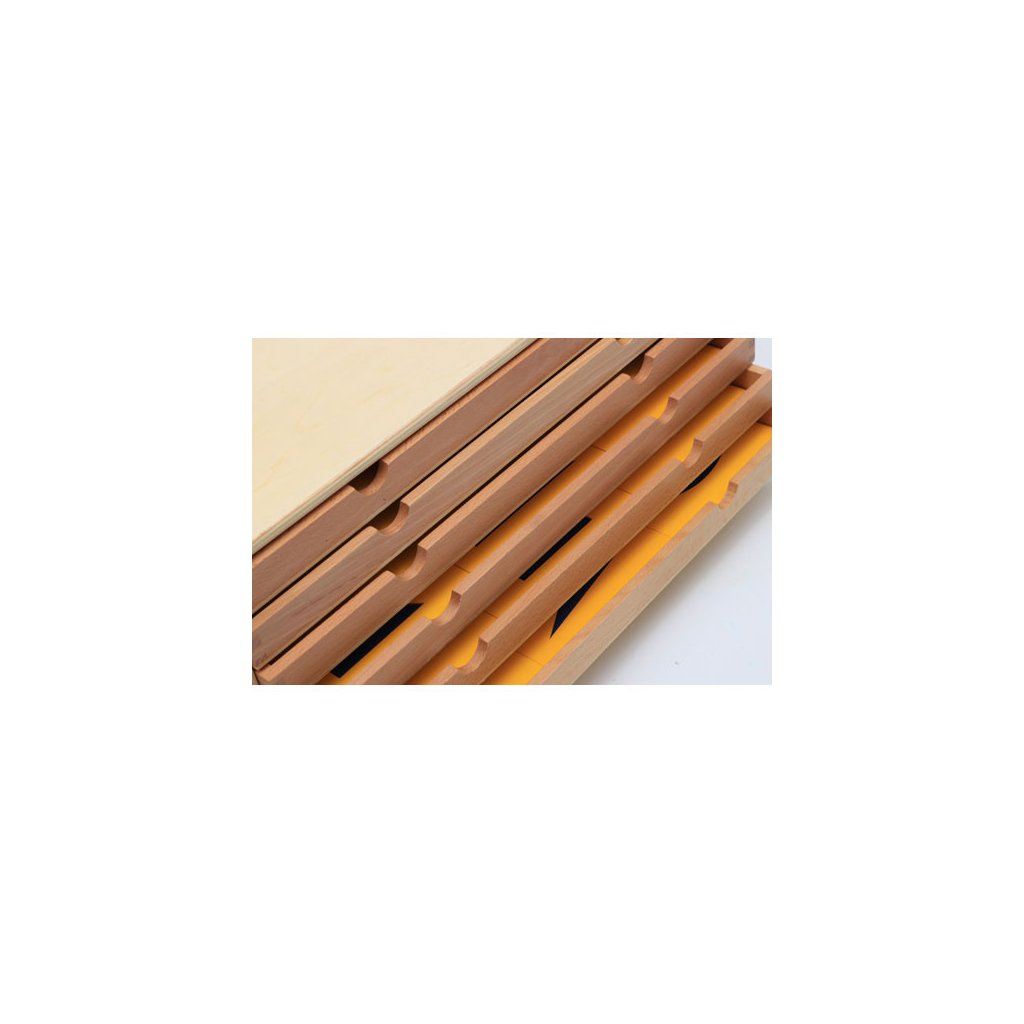 Geometrická komoda obsahuje 6 zásuvek s celkem 36 geometrickými tvary. Tvary jsou modré, dřevěné a lze je obkreslovat. Pro inverzní práci je možné použít žluté dřevěné čtverce. Uloženo na dřevěných tácech se zelenenou podložkou, které jsou v drevěné komodě. Při práci s touto pomůckou je vhodné používat produkt A103 Karty ke geometrické komodě. Obsah šesti zásuvek: 1. zásuvka obsahuje šest kruhů s průměrem od 5 do 10 cm. 2. zásuvka obsahuje šest čtyřúhelníků. První je čtverec. U následujících tvarů se zkracují obě vodorovné strany postupně z 10 cm na 5 cm, zatímco obě svislé strany zůstávají stejně dlouhé. 3. zásuvka obsahuje šest různých trojúhelníků: rovnostranný trojúhelník, rovnoramenný pravoúhlý trojúhelník, nerovnoramenný pravoúhlý trojúhelník, rovnoramenný ostroúhlý trojúhelník, rovnoramenný tupoúhlý trojúhelník a nerovnoramenný tupoúhlý trojúhelník. 4. zásuvka obsahuje šest různých rovnostranných mnohoúhelníků: pětiúhelník, šestiúhelník, sedmiúhelník, osmiúhelník, devítiúhelník a desetiúhelník. 5. zásuvka obsahuje šest tvarů: kosočtverec, rovnoběžník, rovnoramenný lichoběžník, pravoúhlý lichoběžník, deltoid, konkávní čtyřúhelník. 6. zásuvka obsahuje pět tvarů: elipsu, křížovou kytku, vejčitý tvar, trojúhelník s vypouklými stranami, nerovnoramenný ostroúhlý trojúhelník. Pomůcka seznamuje dítě s geometrickými tvary, dopomáhá mu k nácviku vizuálního vnímání a rozlišování různých tvarů, rozvojí jazyku a fantazie.