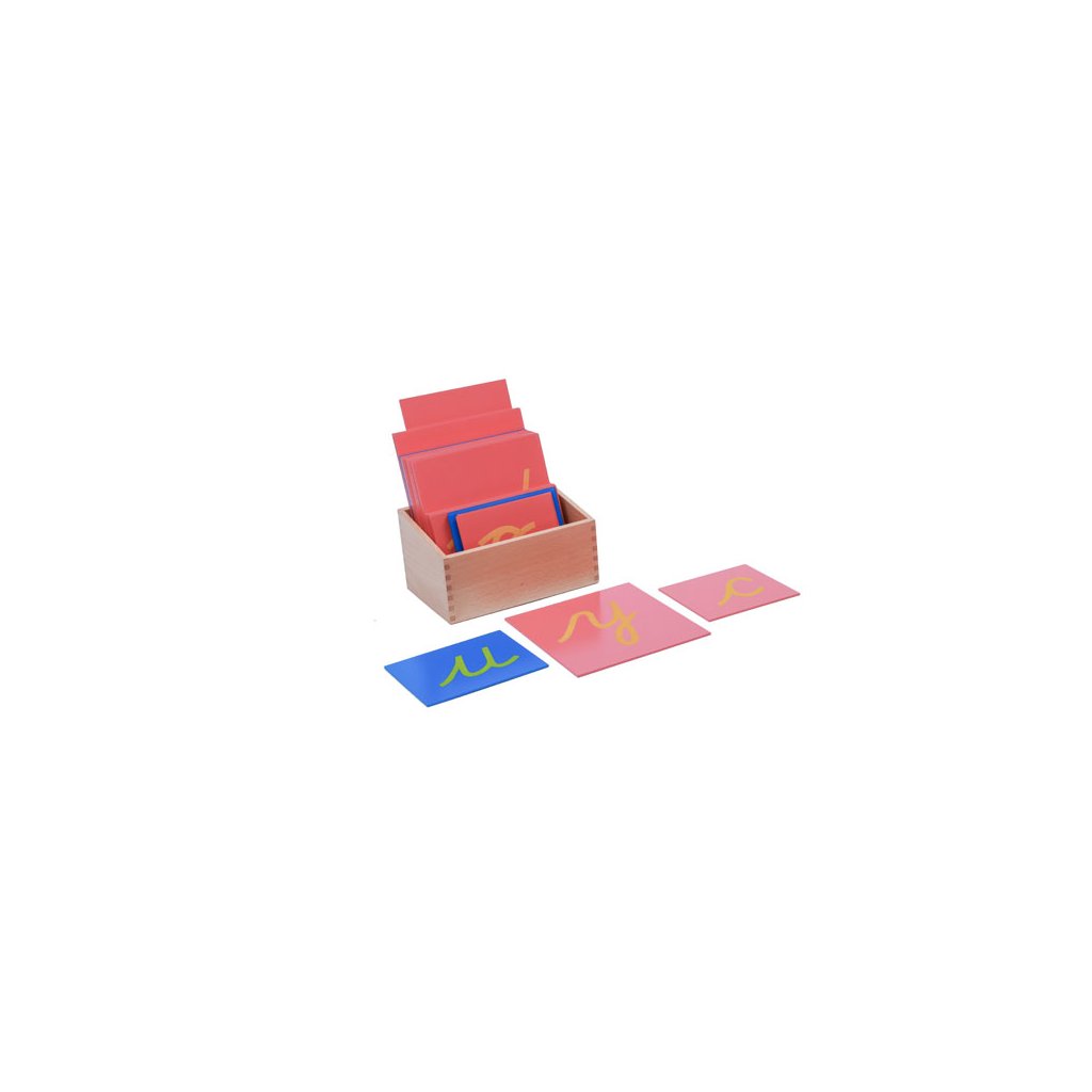 Tato montessori pomůcka pomáhá dětem seznámit se s psacím písmem pomocí smyslového vnímání. Dítě si prstem přejíždí po tvaru písmene s pískovým povrchem a učí se jeho tvar skrze pohyb a hmat.