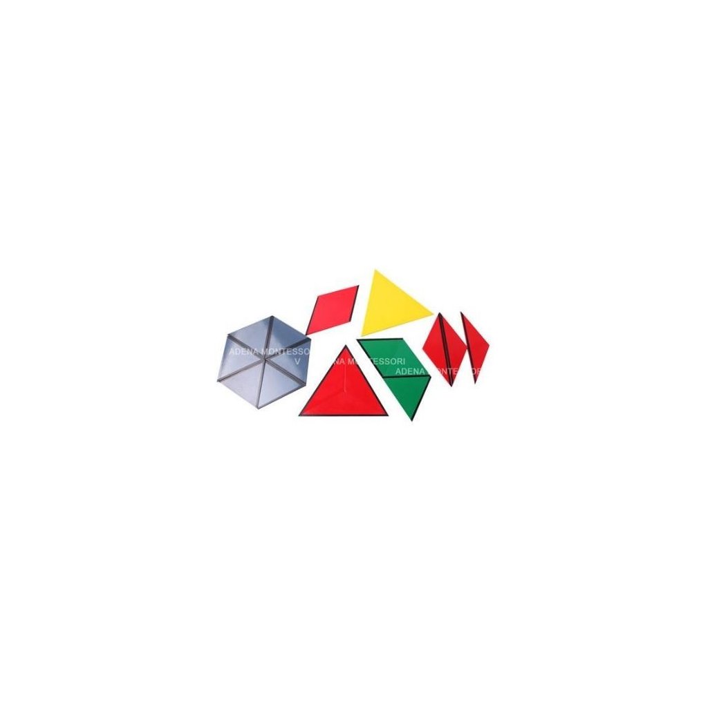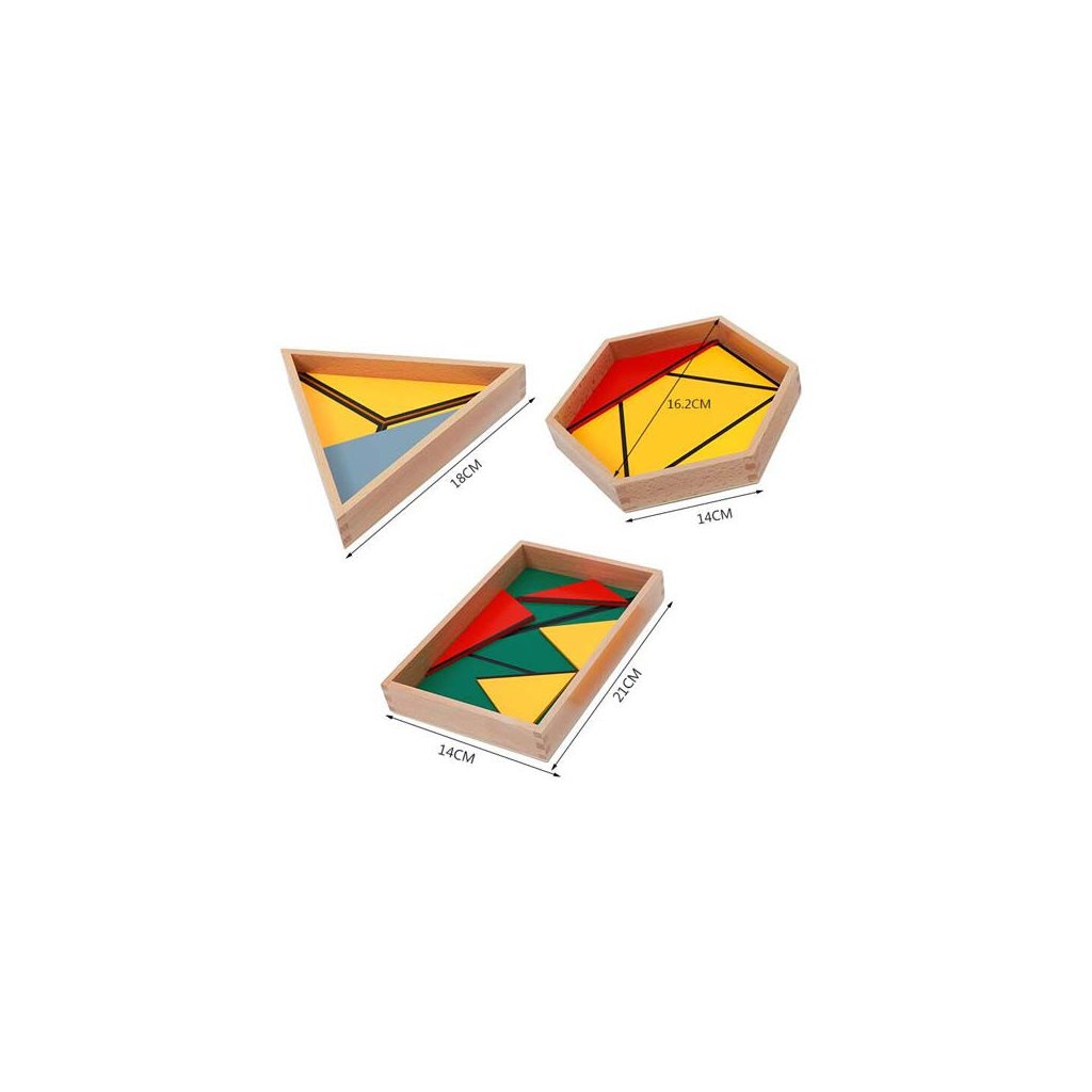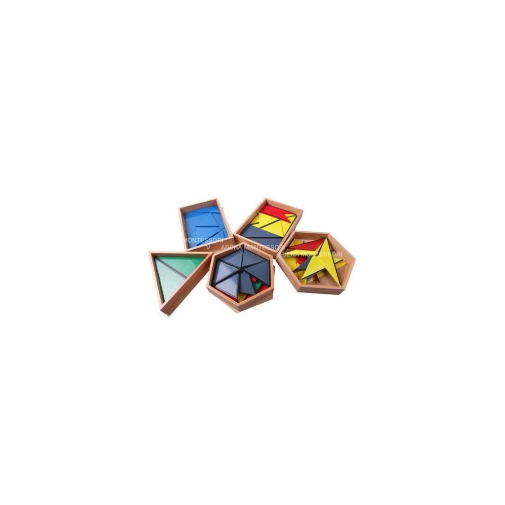 Tato rozsáhlá sada konstrukčních trojúhelníků v pěti dřevěných boxech nabízí dětem možnost objevovat různé druhy trojúhelníků a jejich vzájemné vztahy. Pomocí skládání mohou děti tvořit nové geometrické tvary – například čtverce, obdélníky, lichoběžníky nebo šestiúhelníky.