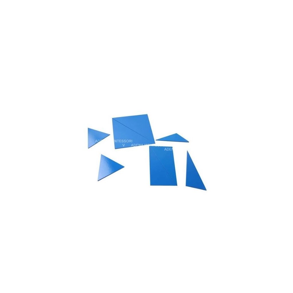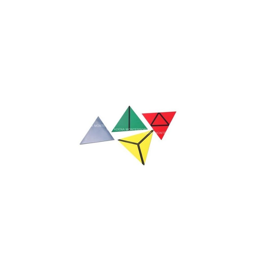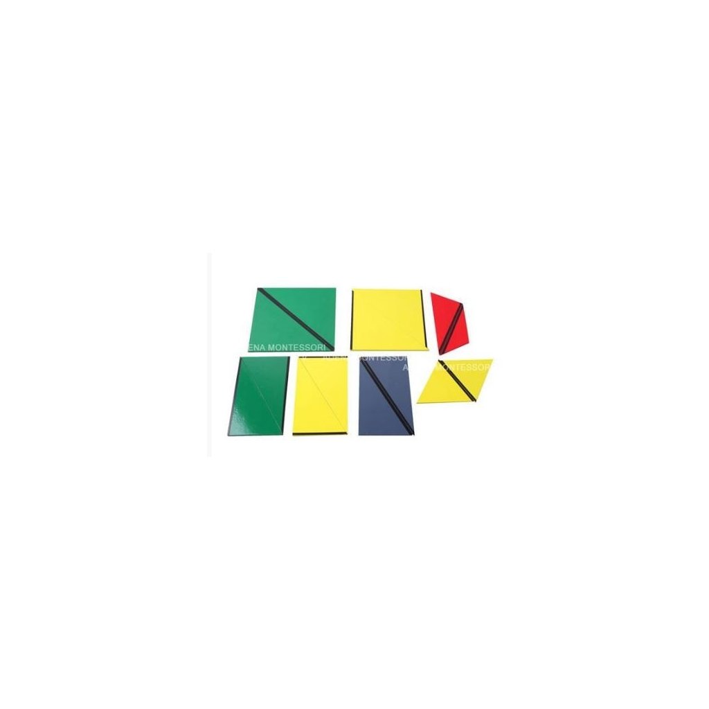 Tato rozsáhlá sada konstrukčních trojúhelníků v pěti dřevěných boxech nabízí dětem možnost objevovat různé druhy trojúhelníků a jejich vzájemné vztahy. Pomocí skládání mohou děti tvořit nové geometrické tvary – například čtverce, obdélníky, lichoběžníky nebo šestiúhelníky.
