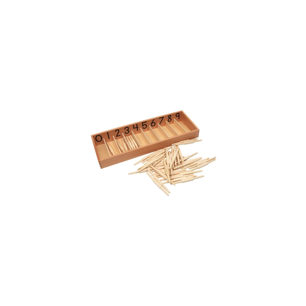 Tato pomůcka slouží k upevnění základního porozumění číslicím 0–9 prostřednictvím manipulace s konkrétními vřeténky. Dítě vkládá správný počet vřetének do přihrádek označených číslicemi a učí se tak vnímat, co znamená číslo jako určité množství.