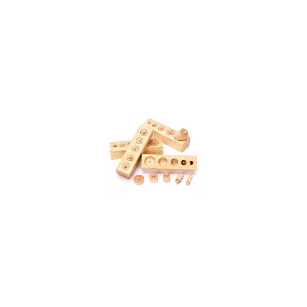 Mini válečky s úchyty od značky Adena Montessori jsou zmenšenou verzí klasického Montessori smyslového materiálu. Sada obsahuje čtyři dřevěné bloky, z nichž každý obsahuje 5 válečků s úchyty. Bloky jsou odstupňované podle obtížnosti a rozvíjejí schopnost dítěte vnímat rozdíly ve velikosti, výšce i šířce.
