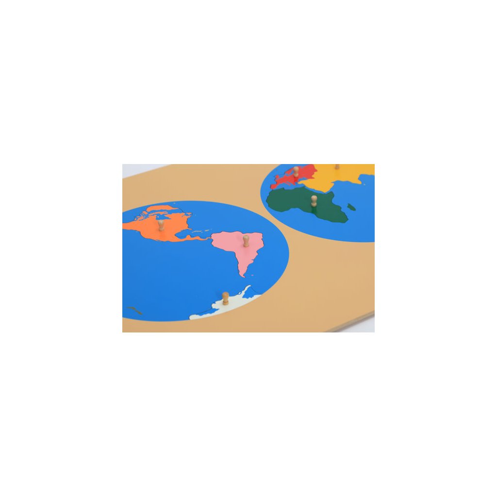 Puzzle mapy umožňují zapojení dalších smyslů při poznávání jednotlivých částí světa. Každý kousek puzzle (představuje jeden světadíl) je opatřen kolíčkem pro snadnější manipulaci. Lze doplnit Kontrolní slepou mapou světa a Kontrolní mapou světa. Kvalitní puzzle z bukového dřeva na dřevěné desce. Velikost menší než zhruba A2.