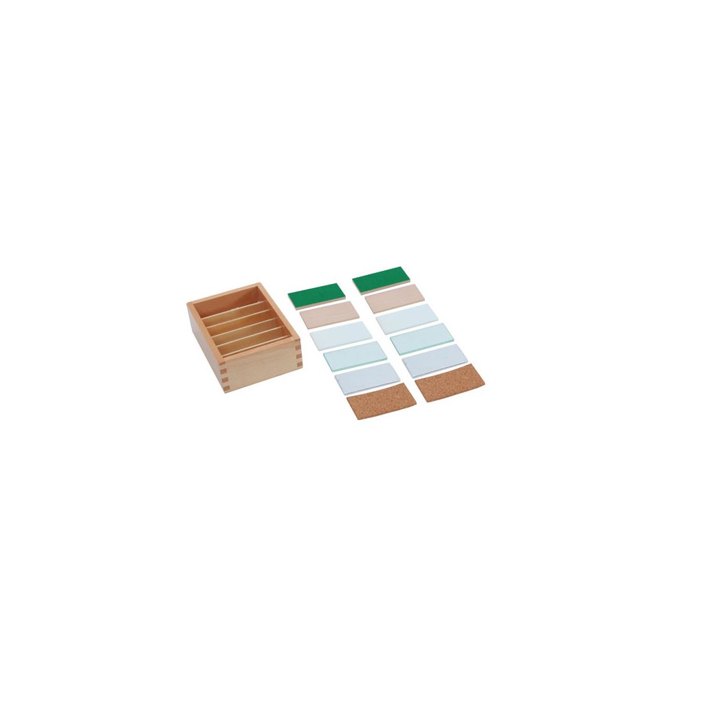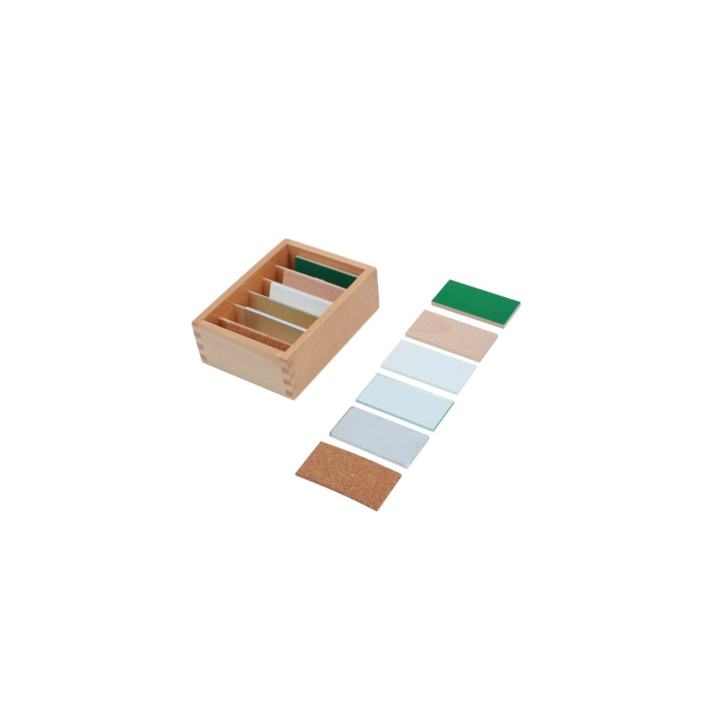 Smyslový materiál k tříbení vnímání teploty. Krabička rozdělená do šesti částí obsahující dvě tabulky, z nichž každá je vyrobena z plsti, dřeva, oceli, břidlice, skla a korku. Rozvíjet u dětí povědomí o rozdílném teplotním "pocitu" materiálů v prostředí, který je způsoben rozdílnou tepelnou vodivostí materiálů.