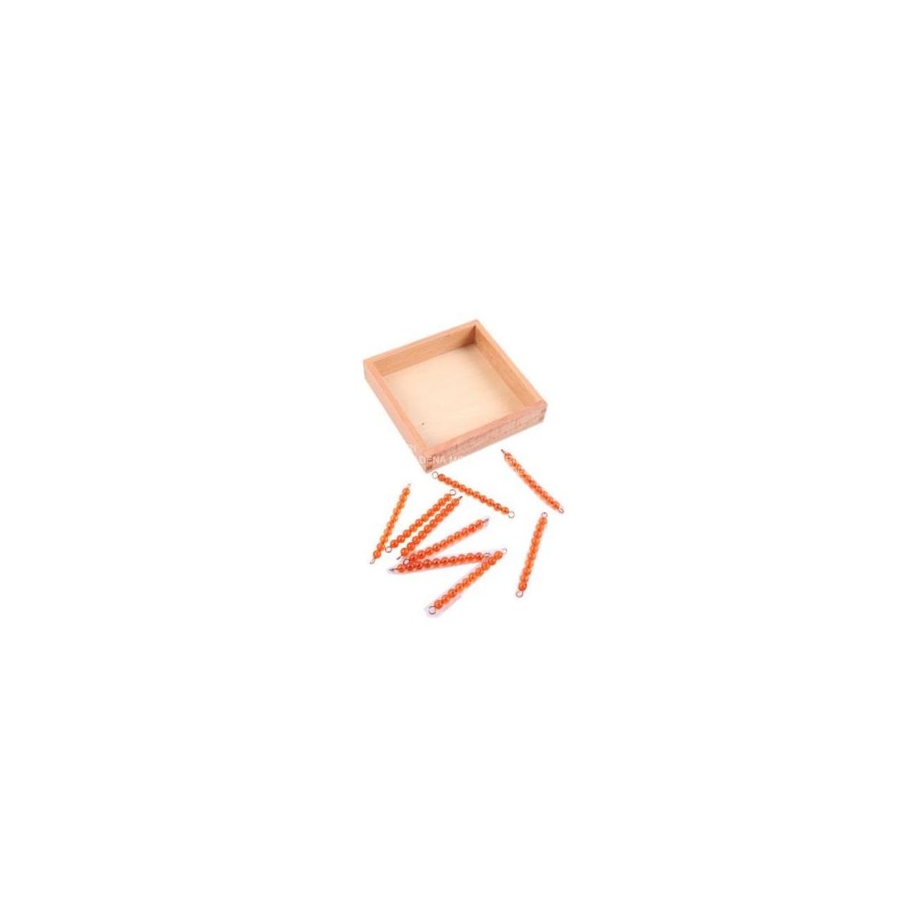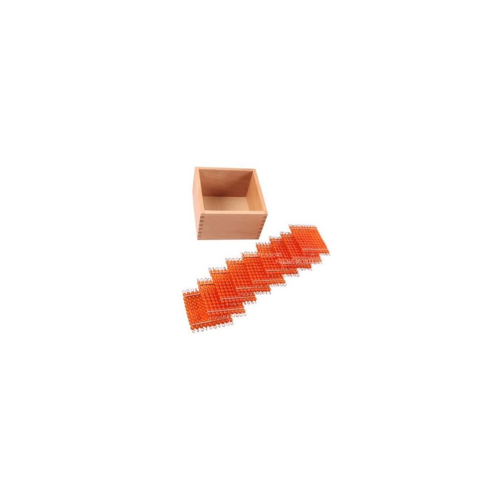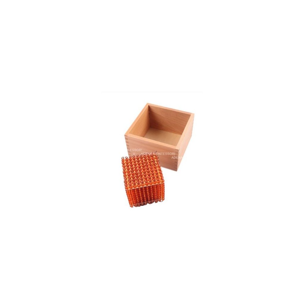 Dřevěný podnos obsahující tisícovkovou krychli, 9 x stovkové destičky, 9 x desítkové tyčky a 9 jednotlivých perliček. Součástí jsou 3 dřevěné krabičky, 1 dřevěný podnos.