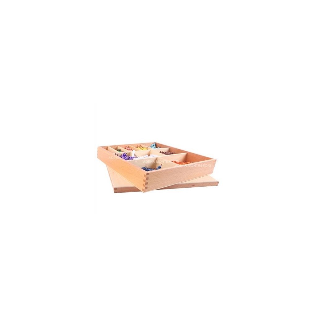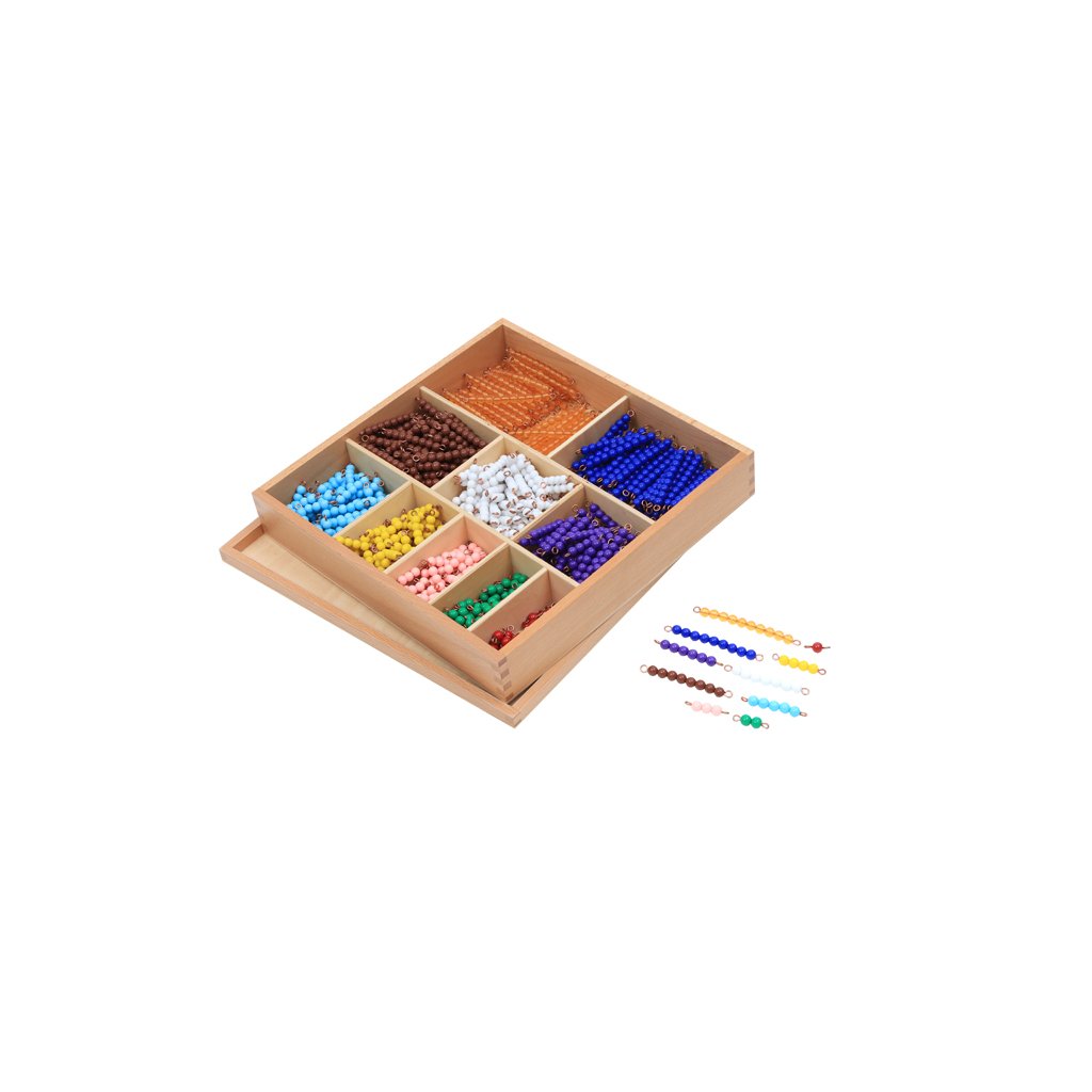 Tato sada obsahuje 55 perlových tyček pro čísla 1 až 10, rozdělených podle barev Montessori systému. Každá délka (1 až 10 perel) má svou vlastní barvu, která zůstává konzistentní napříč všemi Montessori matematickými pomůckami.