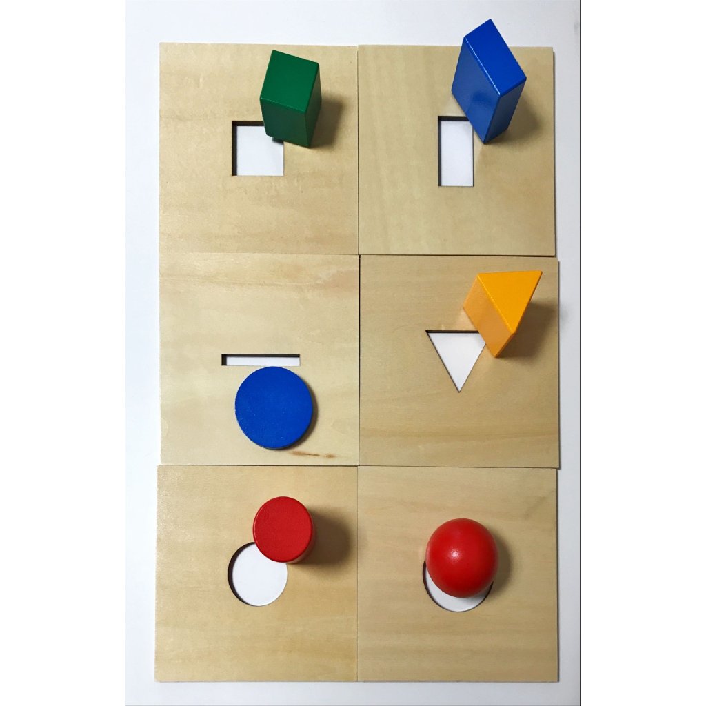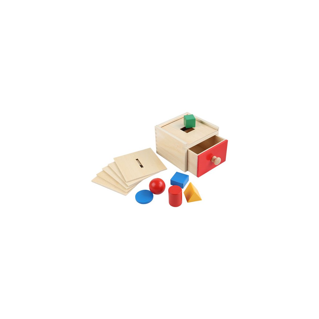 Základ tvoří pevný dřevěný box se šuplíkem, do kterého se zasouvají výměnná víka s různými otvory. Každé víko je určeno pro jiný tvar – dítě tak vhazuje kouli, disk, válec, hranol, jehlan nebo další 3D objekt, a sleduje, jak zmizí… a znovu se objeví ve výsuvném šuplíku. Díky barevným prvkům (tvary i šuplík) je pomůcka vhodná i k prvnímu rozeznávání barev. Navíc se děti přirozeně učí přiřazovat tvary k otvorům, což rozvíjí logiku, jemnou motoriku a prostorové vnímání.