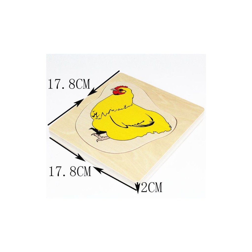 Puzzle slepice pro děti a jejich rozvoj jemné motoriky a poznávání světa okolo nás. Rozměr : 18 X 18 cm Jednotlivé dílky puzzle mají krásné dřevěné úchyty pro snadný úchop a rozvoj jemné motoriky. Sada je určena pro Montessori vzdělávání dětí pod dohledem pedagoga se znalostí principů a postupů. Pomůcka vhodná pro děti 3+. Vyrobeno z nezávadných a certifikovaných materiálů s certifikátem CE. Pomůcka může obsahovat malé součásti které jsou nebezpečné a děti je mohou vdechnout nebo spolknout.