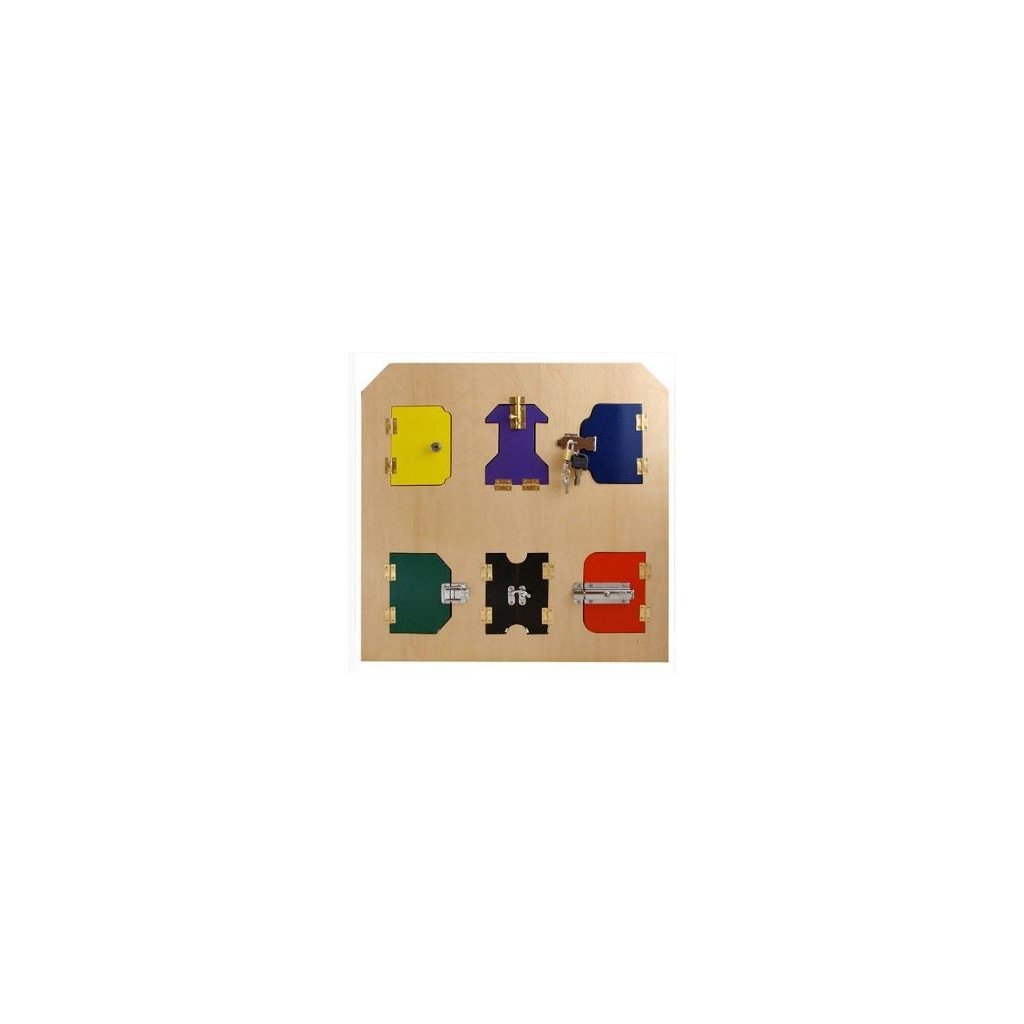 Dítě se seznamuje s různými způsoby uzamčení malých dvířek, které mají navíc různé tvary a barvy. Rozvíjí jemnou motoriku i logické myšlení.