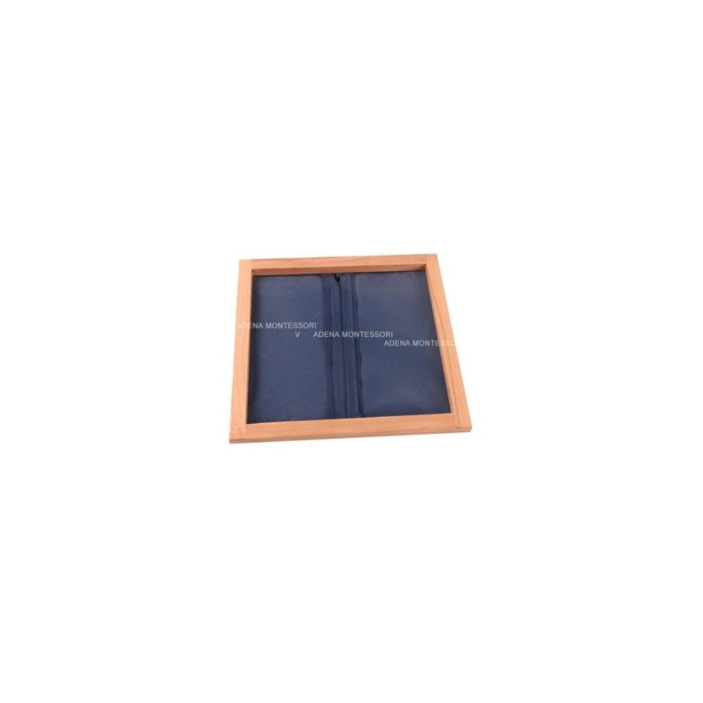 Rámeček z tvrdého dřeva o rozměrech 30 x 31,5 cm. Rám je vyroben z odolného bukového dřeva a ručně tkaného bavlněného materiálu. Dítě se tak naučí pracovat se zipem. Toto cvičení pomáhá rozvíjet koordinaci oka a rukou dítěte, jemnou motoriku prstů ukazováčku a palce, podporuje koncentraci a nezávislost.