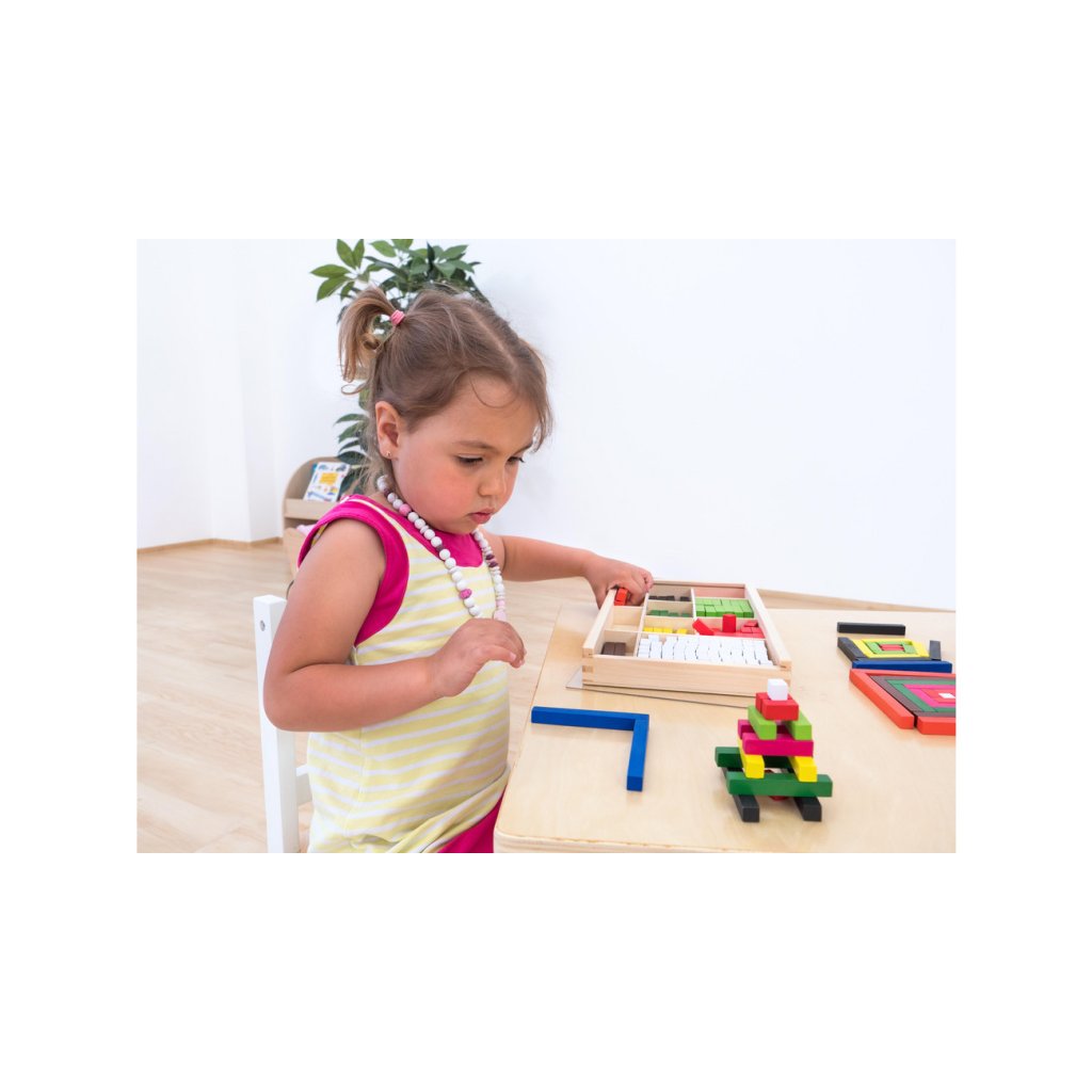 - Dřevěné hranoly různých délek a barev, ze kterých lze skládat různé tvary a vzory.