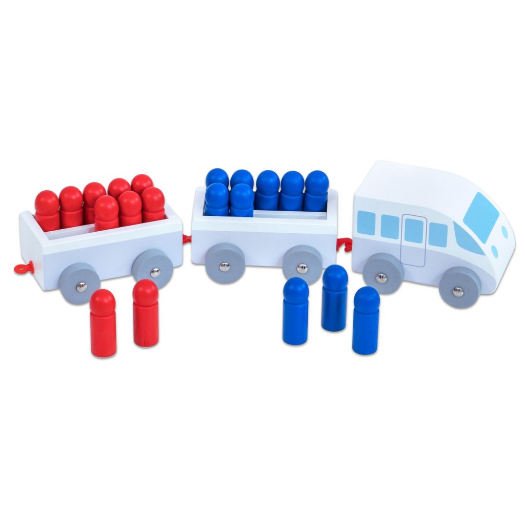 • Obsah balení: dřevěný vláček, červené a modré figurky
