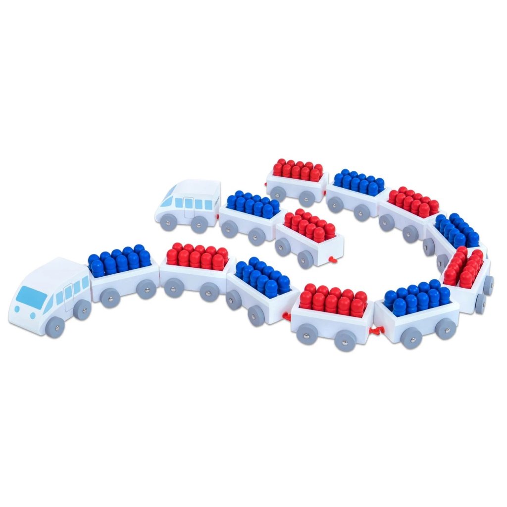 Figurky mohou „nastupovat“ a „vystupovat“ z vláčku a děti přitom sledují, kolik pasažérů ve vláčku zůstává. Takto se učí chápat matematické vztahy přirozeně a názorně – skrze pohyb, barvy a hru.