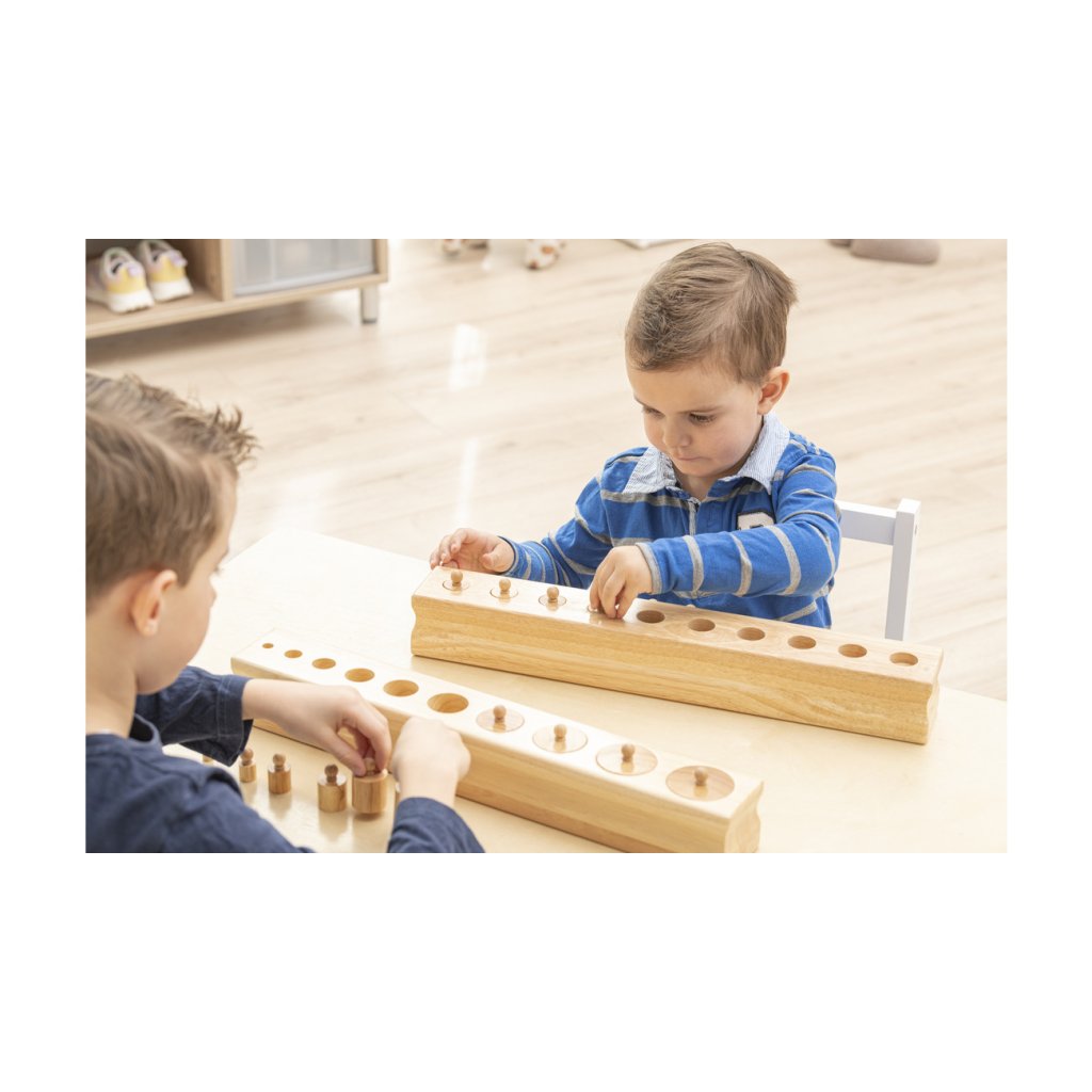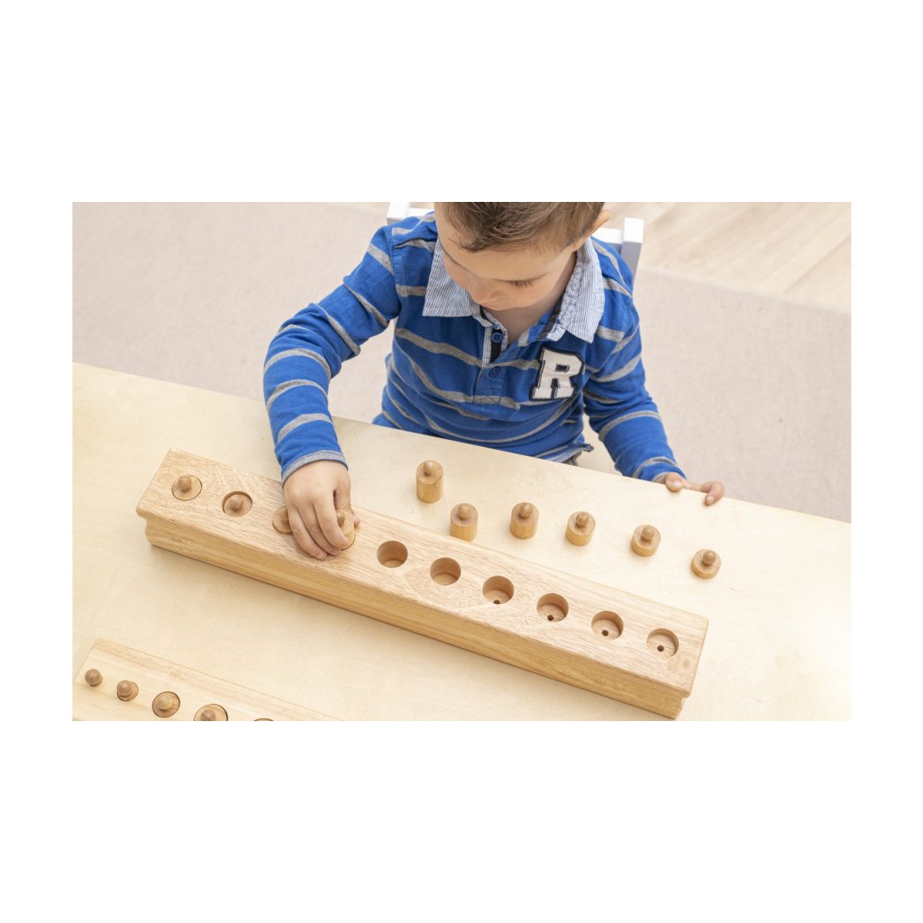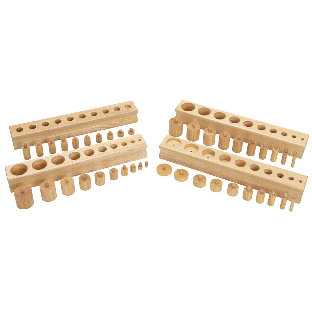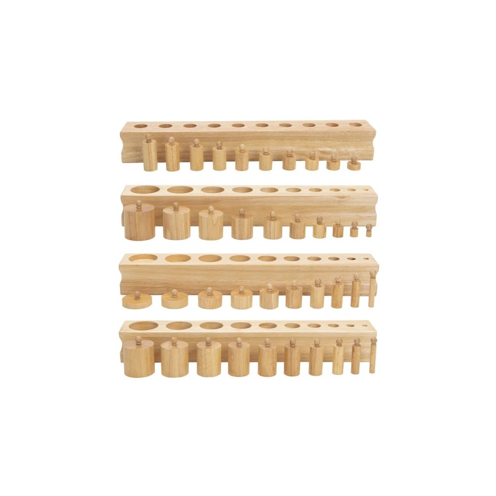 Montessori válečky s úchyty od značky Betzold patří mezi klíčové pomůcky smyslové výchovy. Sada obsahuje čtyři masivní dřevěné bloky, z nichž každý má 10 různě tvarovaných válečků s úchyty. Bloky jsou odstupňovány podle typu rozměrové změny a navazují na Montessori princip izolace vlastnosti – dítě se tak učí vnímat a porovnávat výšku, průměr i kombinaci obojího.
