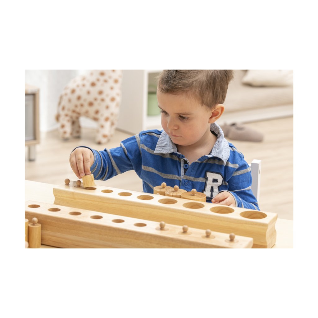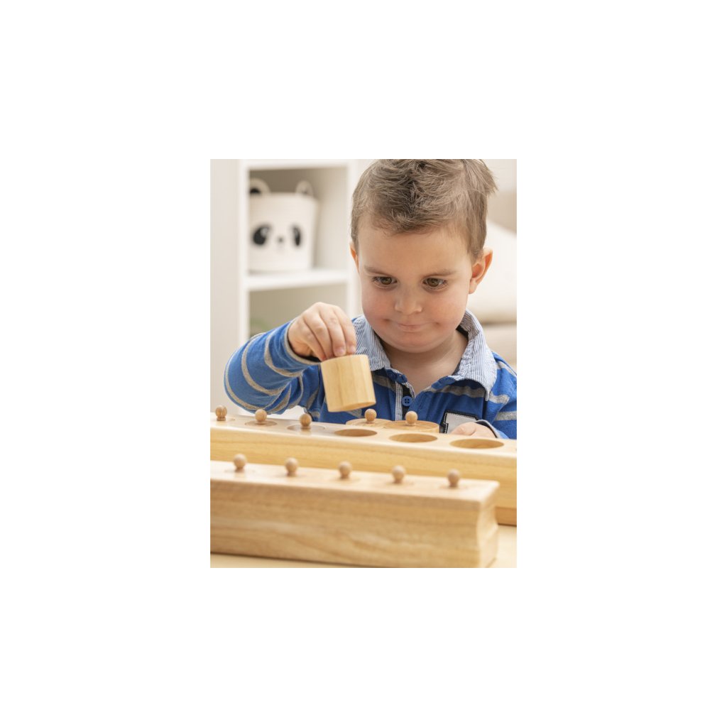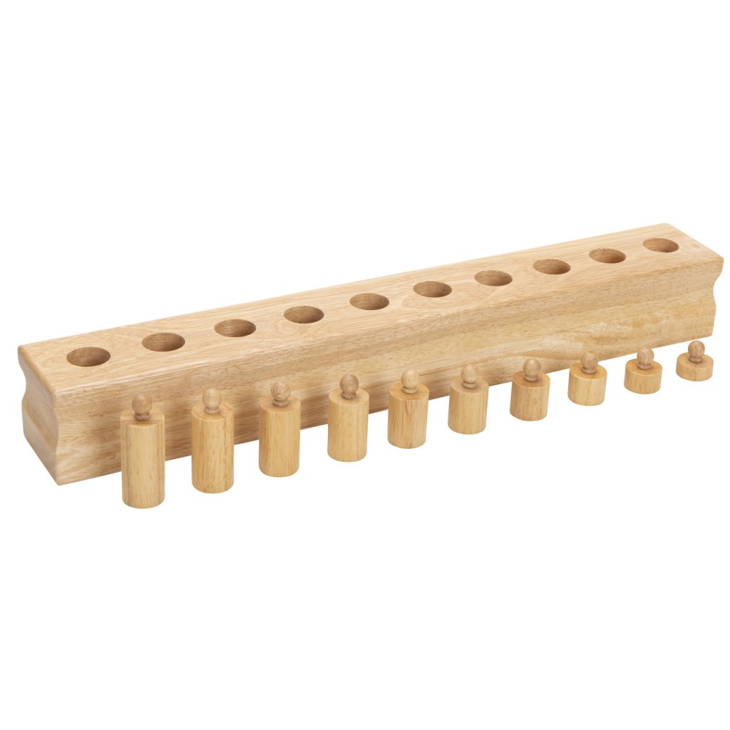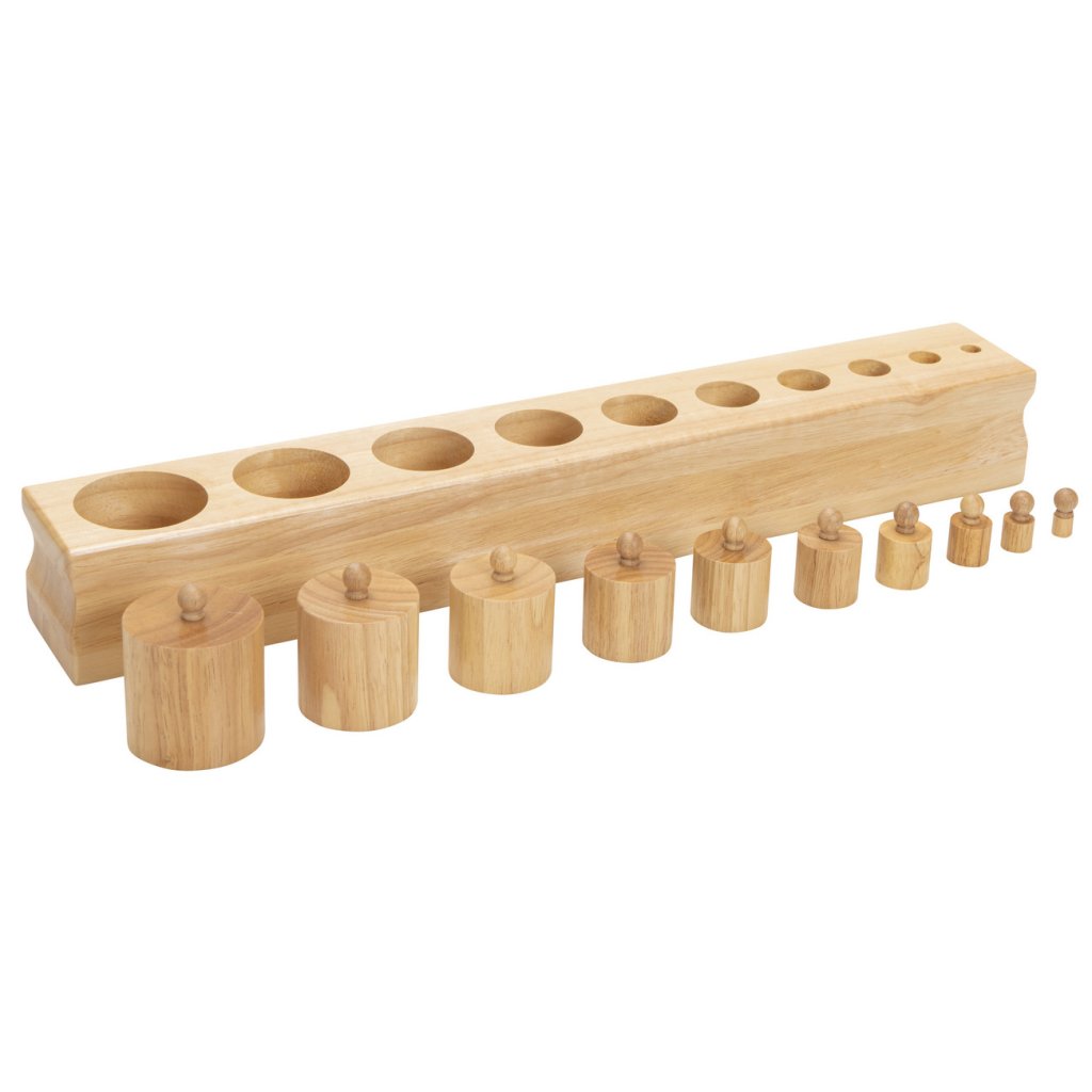 Montessori válečky s úchyty od značky Betzold patří mezi klíčové pomůcky smyslové výchovy. Sada obsahuje čtyři masivní dřevěné bloky, z nichž každý má 10 různě tvarovaných válečků s úchyty. Bloky jsou odstupňovány podle typu rozměrové změny a navazují na Montessori princip izolace vlastnosti – dítě se tak učí vnímat a porovnávat výšku, průměr i kombinaci obojího.