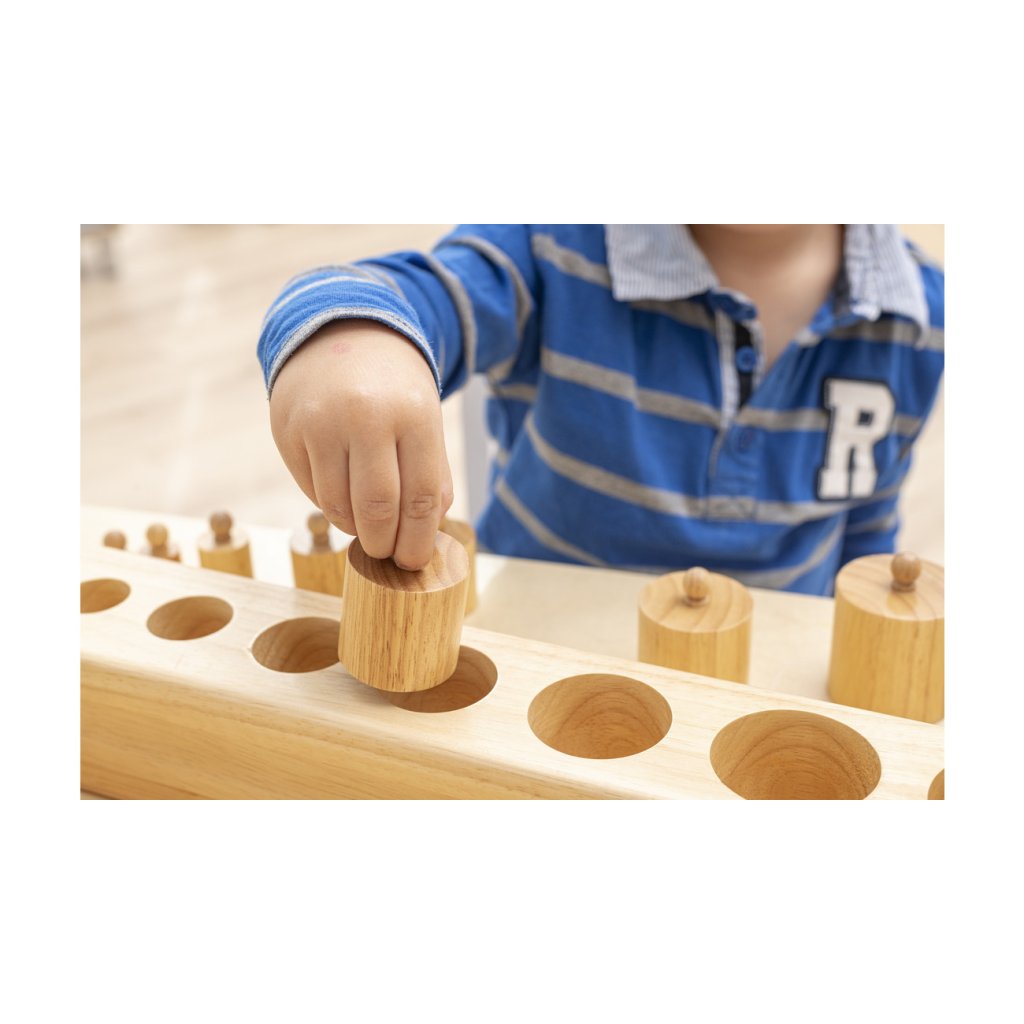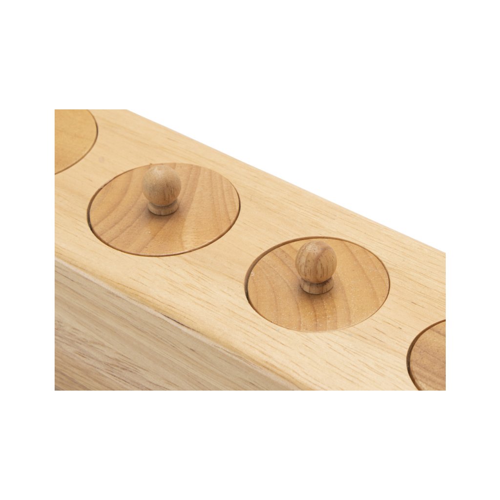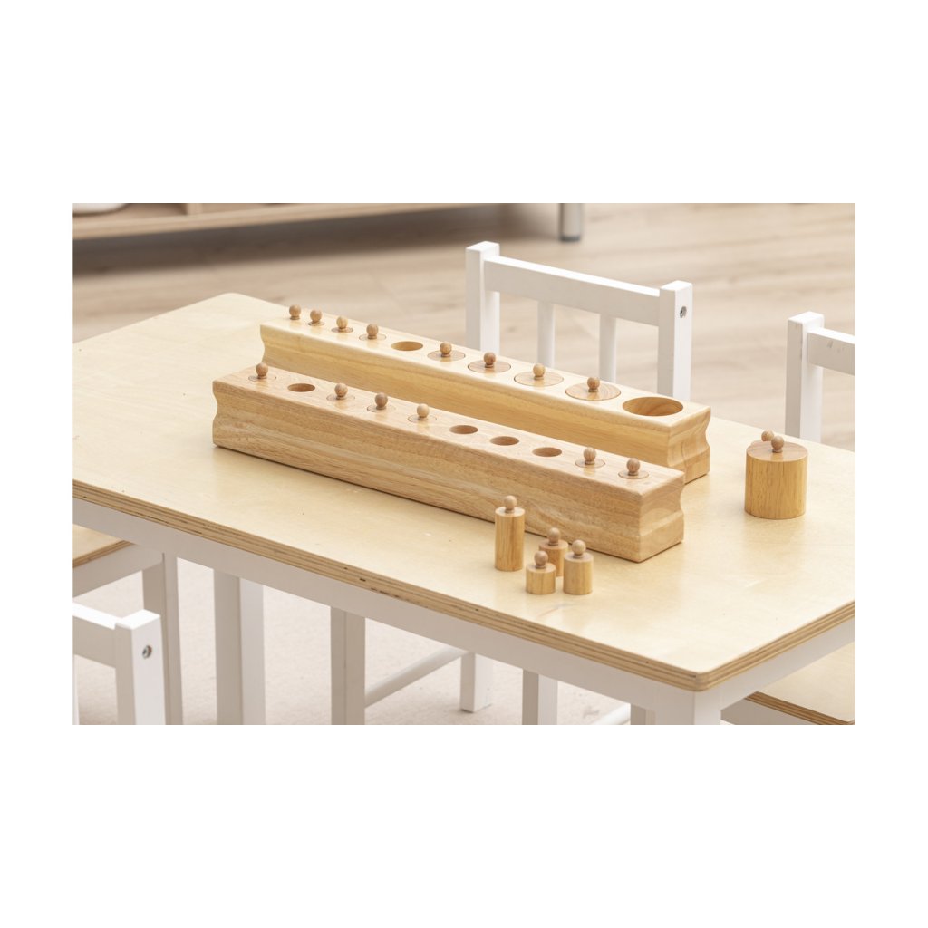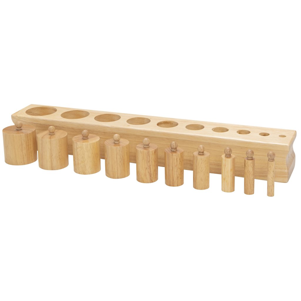 Montessori válečky s úchyty od značky Betzold patří mezi klíčové pomůcky smyslové výchovy. Sada obsahuje čtyři masivní dřevěné bloky, z nichž každý má 10 různě tvarovaných válečků s úchyty. Bloky jsou odstupňovány podle typu rozměrové změny a navazují na Montessori princip izolace vlastnosti – dítě se tak učí vnímat a porovnávat výšku, průměr i kombinaci obojího.
