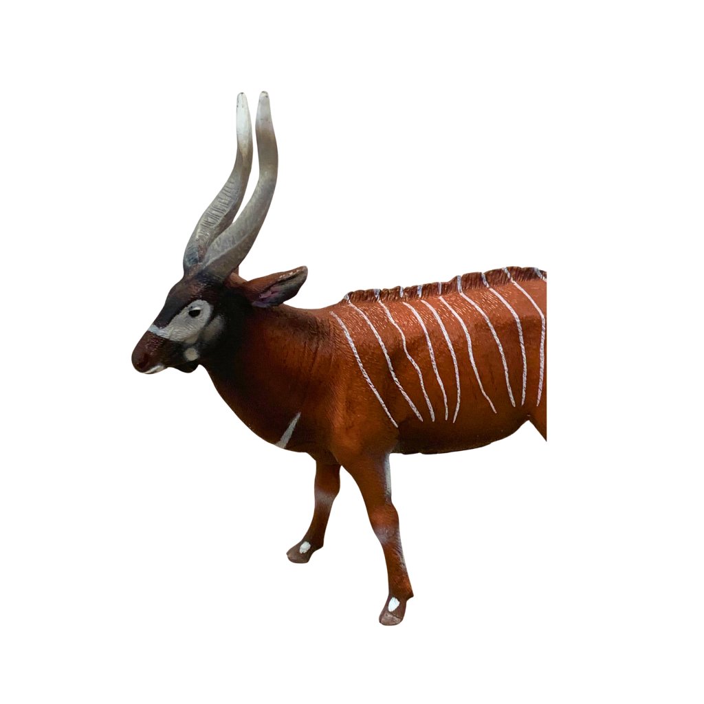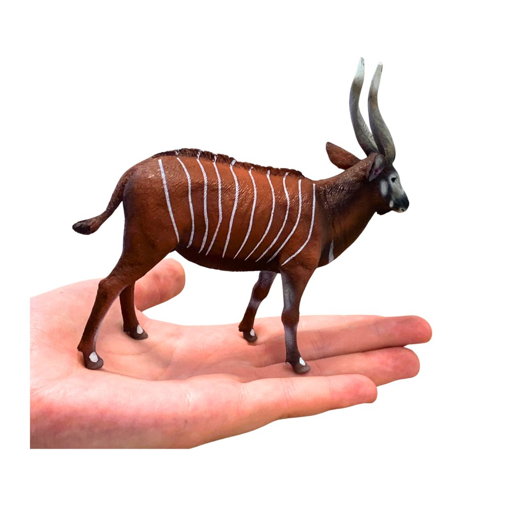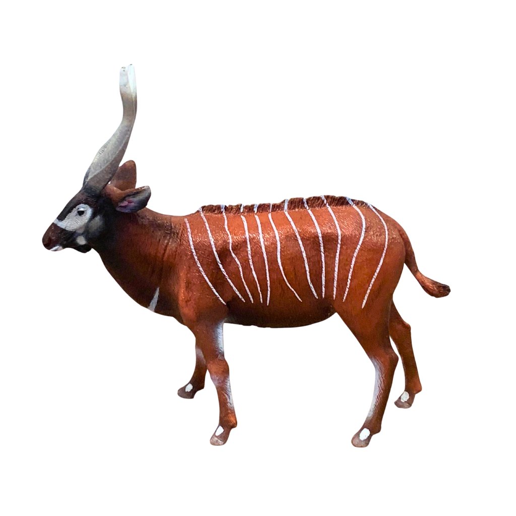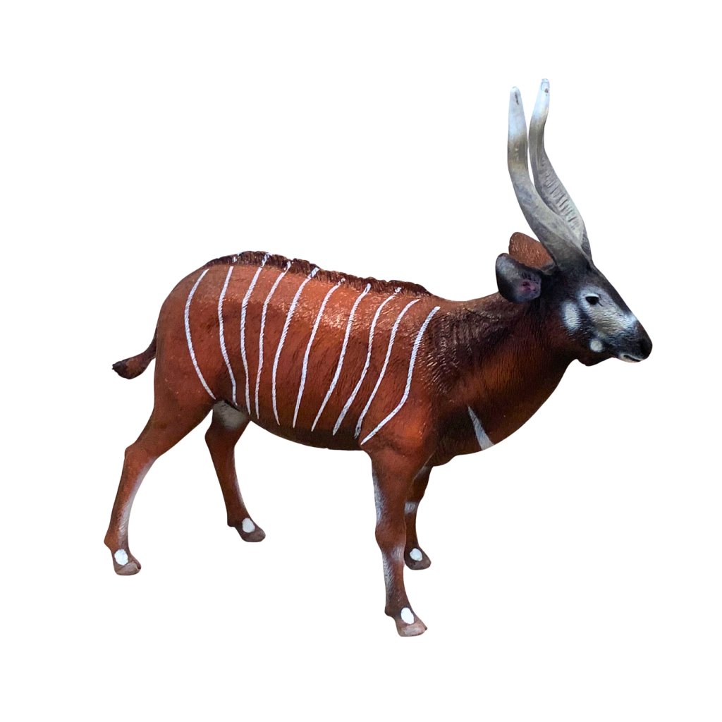 Antilopa bongo patří k nejkrásnějším a zároveň nejméně známým druhům antilop. Její elegantní tělo zdobí sytě rezavohnědá srst s bílými pruhy, která jí pomáhá splynout s prostředím tropických deštných lesů. Figurka od značky Collecta zobrazuje dospělého jedince v klidném postoji s výraznými spirálovitými rohy. Je vhodná pro děti i sběratele.