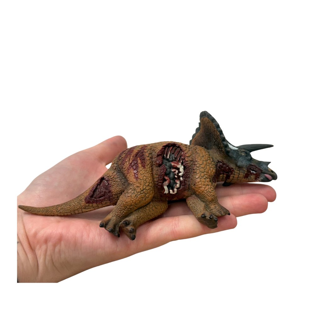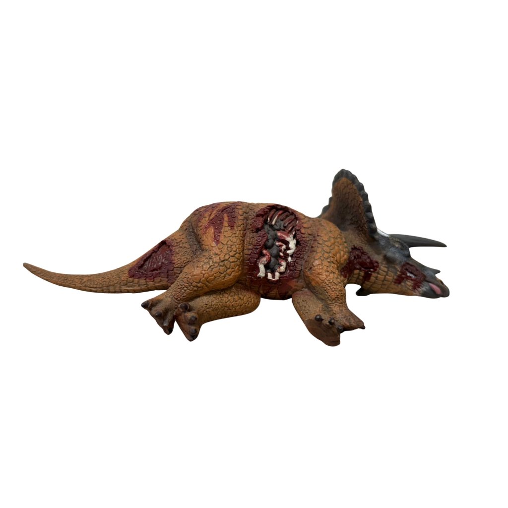 Tato netradiční figurka představuje Triceratopse ve chvíli po útoku predátora. Věrně ztvárněné zranění, poloha těla a realistické proporce dělají z této figurky fascinující a edukativní prvek vhodný pro školy, muzea i sběratele.