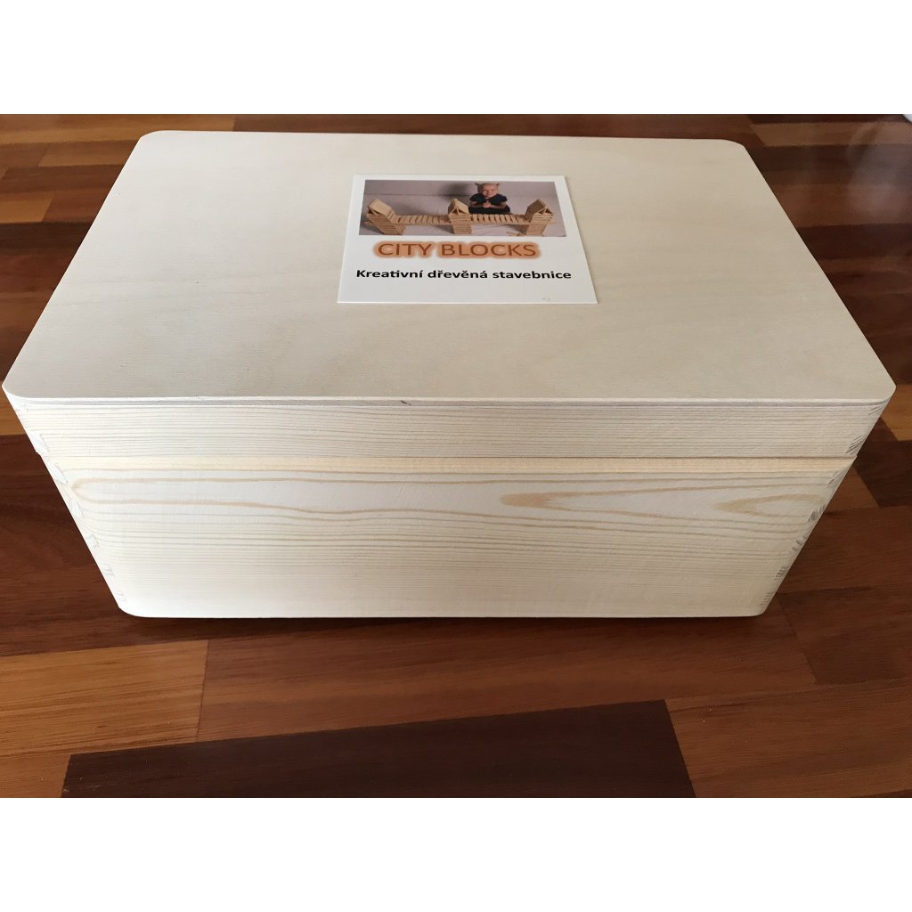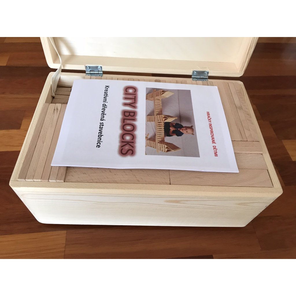 Dřevěná stavebnice - Sada City Blocks obsahující 150ks hranolů v exklusivní dřevěné krabici/ truhle. Kreativní hračka pro děti i dospělé. Dřevěná stavebnice má jediný prvek - dřevěný bukový hranol s výjimečně přesnými rozměry. Rozměr hranolu 115 x 23 x 8 mm. Díky přesnému zpracování a rovnosti povrchu lze s tímto stavebním prvkem postavit neobyčejně krásné a působivé stavby. Stavby drží pohromadě pouze pomocí gravitačních sil a tření, žádné lepení nebo spojovací prvky! Kreativita přináší radost do života lidí, což je důvod, proč je umění tak důležité. Budoucí architekti a inženýři objevují své schopnosti a dovednosti pro stavění již v raném věku. Postavte si věž, hrad, dům nebo loď. Pro děti od 3let do 99 let. Čím více kusů dřívek, tím více zábavy. Baleno v uzavíratelné dřevěné krabici s víkem z borového dřeva. Rozměr boxu 30X20X14 CM Obsahuje návod/inspirace pro různé stavby, které se dají postavit z určitého počtu hranolů. Skvělá zábava pro děti i dospělé. Podívejte se jak staví profesionálové z City Blocks ligy: https://www.youtube.com/watch?v=6jv4evdglMY
