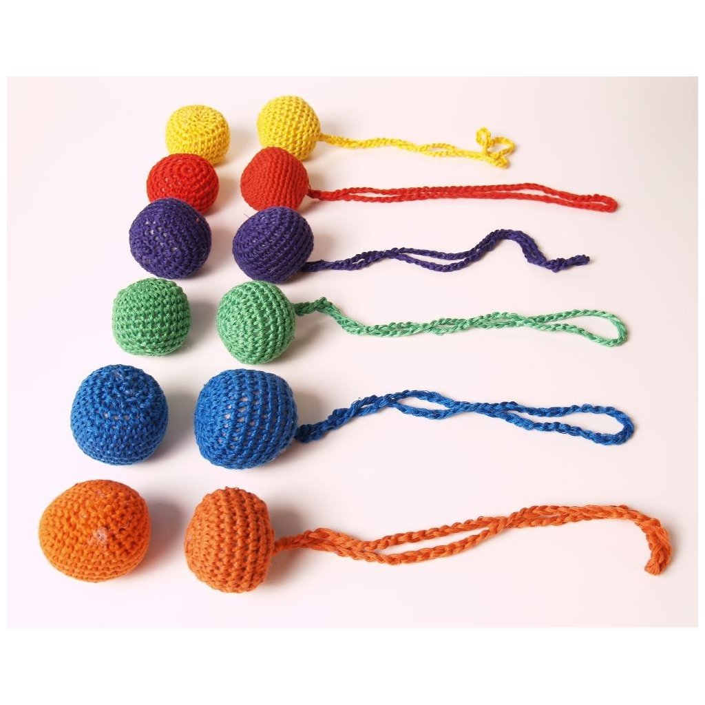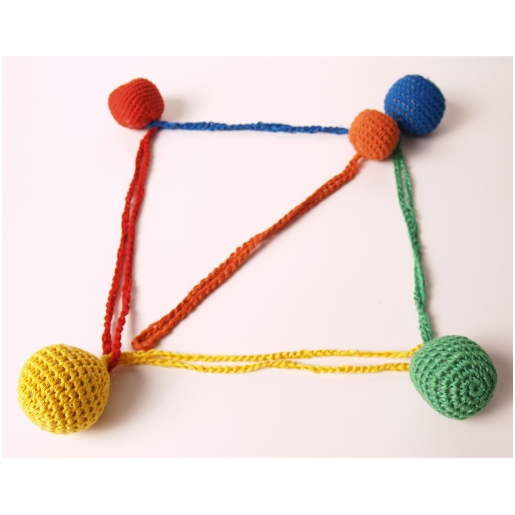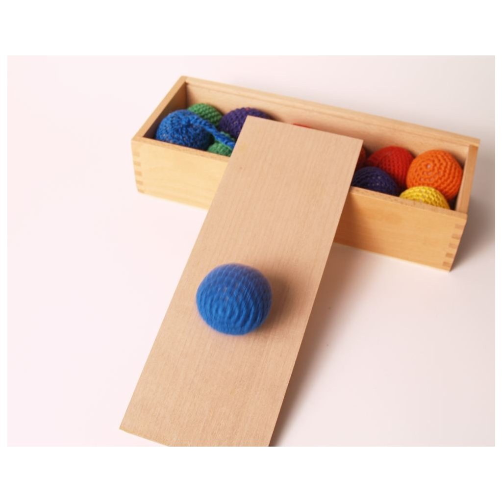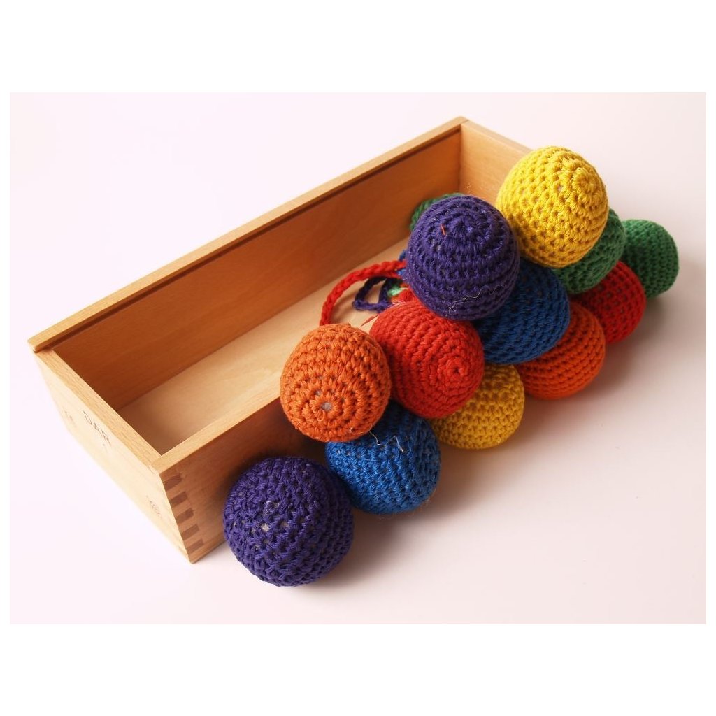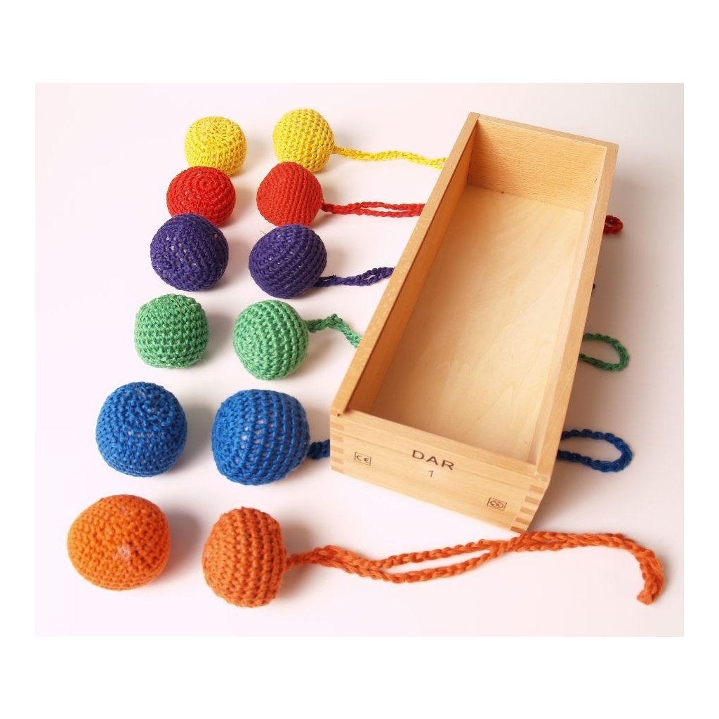 Pan Froebel poznal, že míč je často první nebo oblíbenou hračkou dětí. Je lehký a snadno ho lze uchopit nebo držet. Koule je symbolem jednoty, protože je to uzavřený celek v čisté formě. Celek je začátek chápání a všechno další je odvozeno z celku. Dítě vytváří své první dojmy z fyzického světa, kdy drží, pohybuje nebo sleduje míč. Hra s objekty a interakce s průvodcem pomáhá dítěti začít rozlišovat jeho samotného od zbytku světa. Tato pomůcka je tedy důležitá pro rozvoj raných dojmů, rozvoj řeči a zlepšení očního kontaktu. Míčky pomáhají dítěti začít rozlišovat tvar, barvu a pohyb – vlastnosti hmoty a fyzického vesmíru. Zlepšuje koordinaci oko ruka a hrubé motoriky. Zatímco další Froebel Dary jsou rozděleny na formy života, krásu formy a rozvoj dalších znalostí, první Dar má umožnit jednoduchou hru a poznat tvar, barvu a pohyb. Účel Daru: Určeno pro nejmenší děti od 1 roku, kdy si dítě vytváří první dojmy z fyzického světa Tato pomůcka je tedy důležitá pro rozvoj raných dojmů, rozvoj řeči a zlepšení očního kontaktu. Míčky pomáhají dítěti začít rozlišovat tvar, barvu a pohyb Obsah balení: 6 samostatných míčků a 6 míčků na pleteném závěsu v základních barvách modrá, červená, žlutá a sekundárních barvách vycházejících ze základních fialová, oranžová a zelená. Míčky jsou z měkkého pleteného materiálu a jsou uloženy do krabičky z bukového dřeva