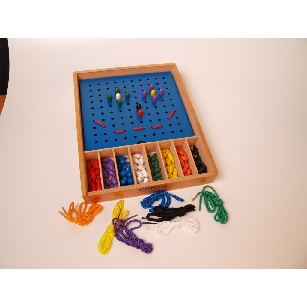 Účel Daru: U menších dětí rozvíjí tento Dar jemnou motoriku a špetkový úchop. U větších dětí využijeme destičku pro pochopení a procvičování malé násobilky. Ve spojitosti s Darem 11 a 8 pak můžeme navlékáním tvarů na tyčky trénovat matematiku sčítání, odčítání a násobení. Dar má tedy využití pro dítě od mateřské školy až po první stupeň základní školy. Obsah balení: Sada obsahuje modrou destičku se 100 otvory a barevné tvary čudlíky vždy 10ks v osmi různých barvách - oranžová, modrá, červená, zelená, žlutá, purpurová, bílá a černá. Ke každé barvě je přiložena ještě barevná šňůrka. Celkem tedy 80ks čudlíků a 8ks sňůrek. Vyrobeno z kvalitního bukového lakovaného dřeva. Vše je uloženo do krabičky z bukového dřeva.