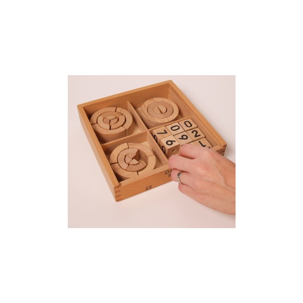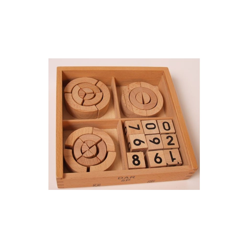 Účel Daru: Určeno pro pochopení, že celek je tvořen zlomky. Určeno pro děti od 4 let Obsah balení: Obsahuje 3ks válců (průměr 75 mm, výška 25mm) a 9 krychliček (25x25x25mm) s číslicemi. Válce jsou dále rozděleny na 3 vrstvy a každý z válců podélně rozdělen na jiný počet části. Jeden je rozdělen na polovinu, jeden na třetinu a jeden na čtvrtinu. Celkem tedy 27ks specifických tvarů. Vše je uloženo do krabičky z bukového dřeva.