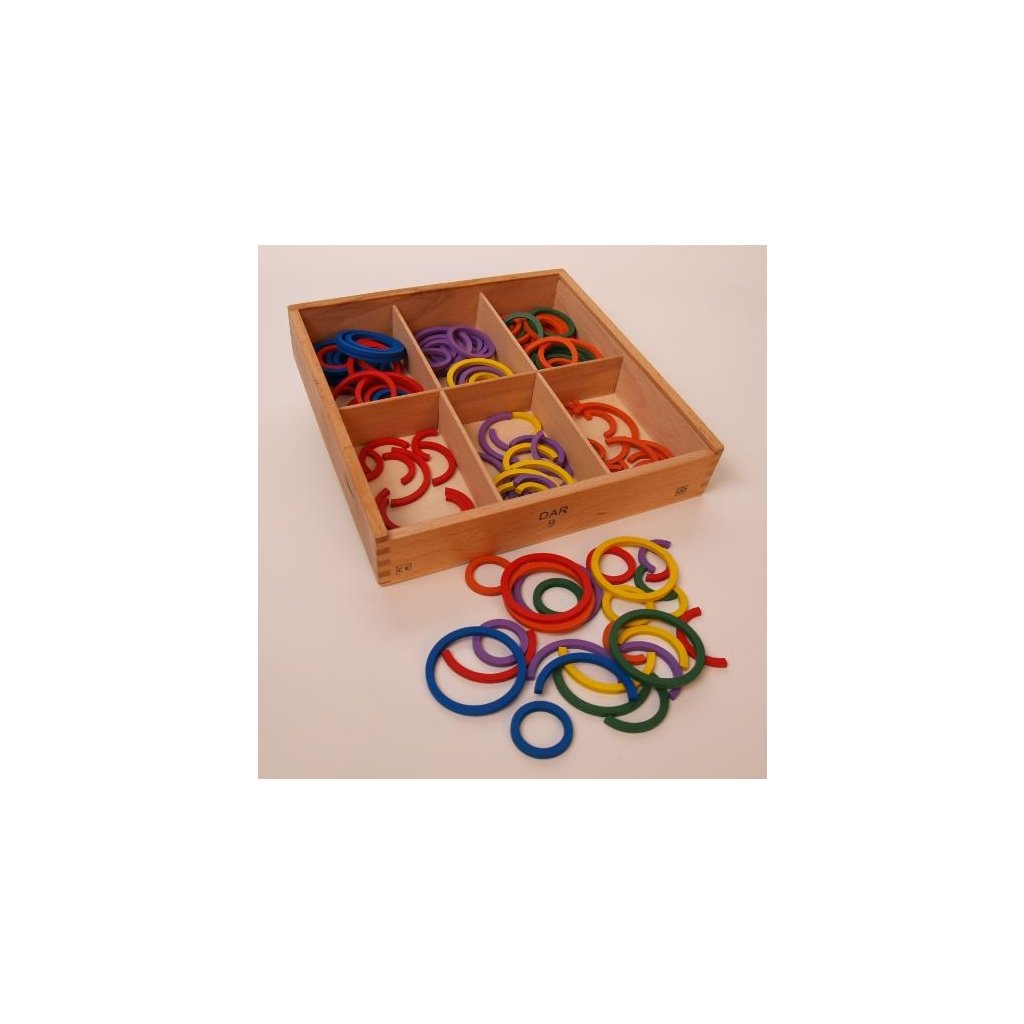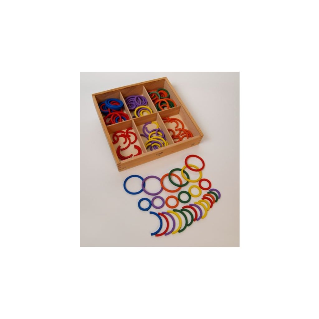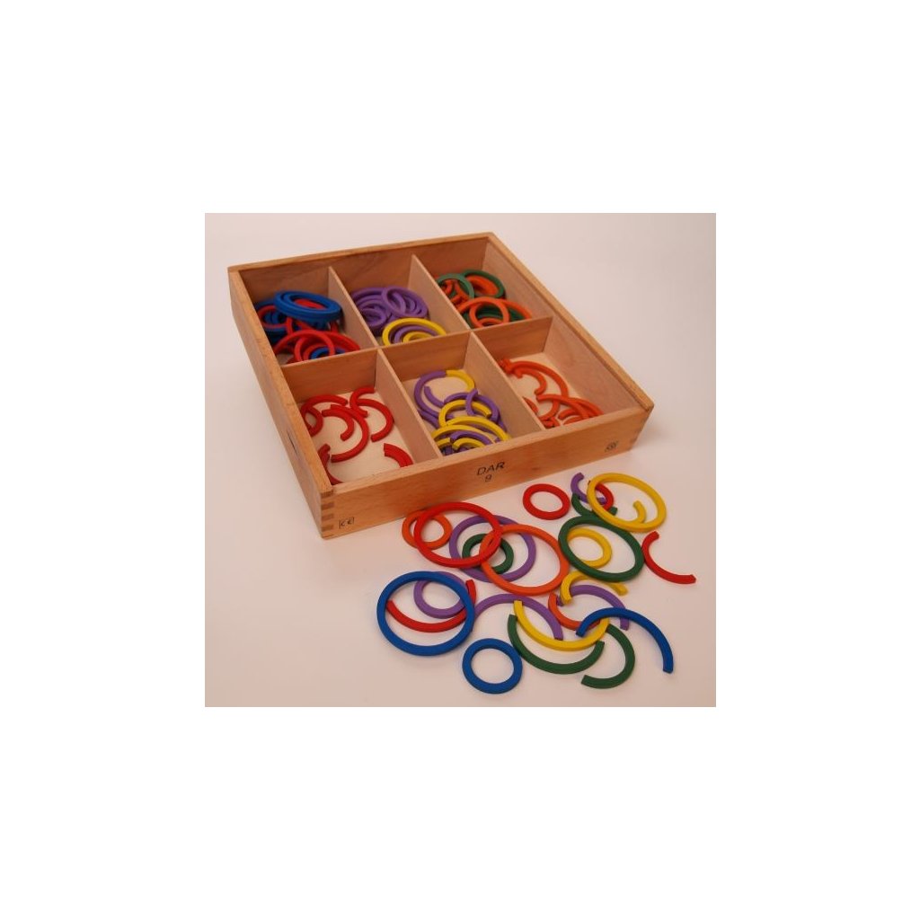 Účel Daru: Rozvíjí schopnosti abstraktního myšlení. Vytvářet je možné jak uzavřené tak otevřené tvary. Symetrické i asymetrické obrazce Pro školní děti pomáhá vizualizovat množiny, dělení čísel a další Určeno pro děti od 4 let Obsah balení: Sada obsahuje obrys kruhu a polokruhu tří různých vnitřních průměrů. Každý tvar je obsažen 5x a to v šesti různých barvách - oranžová, modrá, červená, zelená, žlutá, purpurová. Celkem tedy 180 ks barevných tvarů. Vyrobeno z kvalitního bukového lakovaného dřeva. Vše je uloženo do krabičky z bukového dřeva.