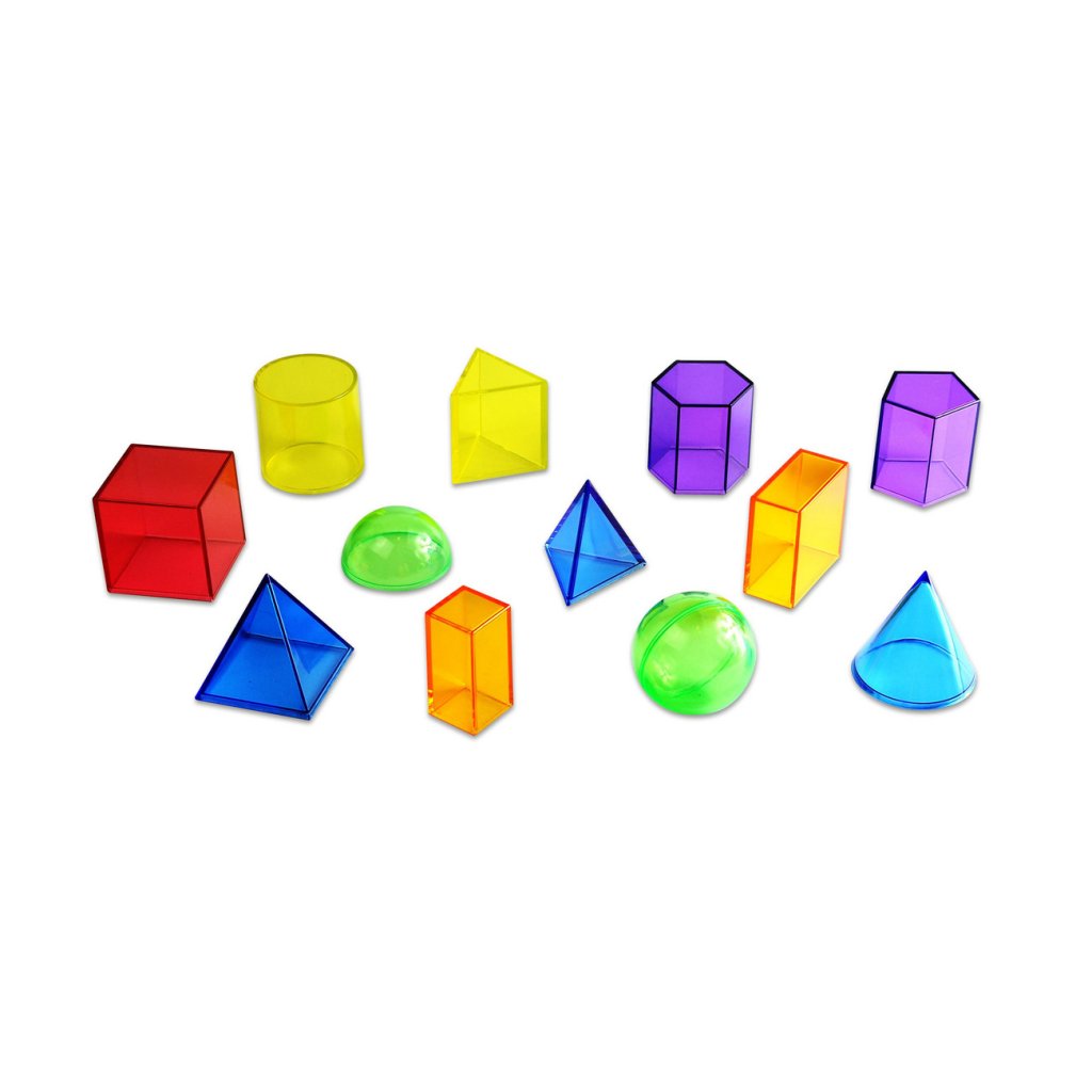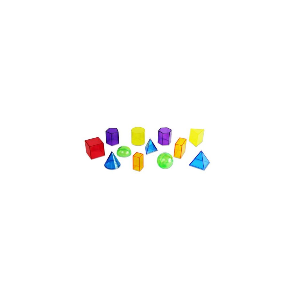 - 12 kusů geometrických těles, v 6 průhledných barvách.