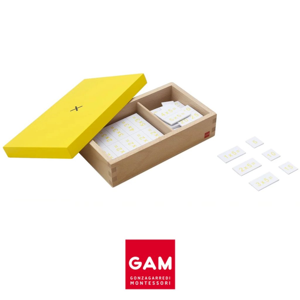 Krabička s příklady na násobení slouží k procvičování všech kombinací násobení čísel od 1 × 1 do 10 × 10. Dítě pracuje s kartičkami, na kterých jsou uvedené jednotlivé příklady, a hledá k nim správné výsledky.
