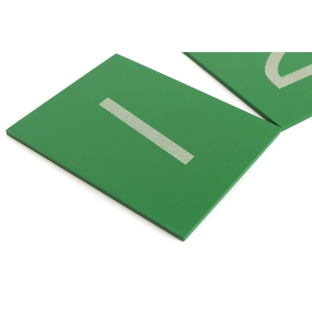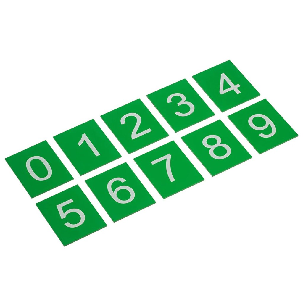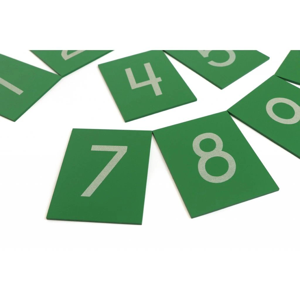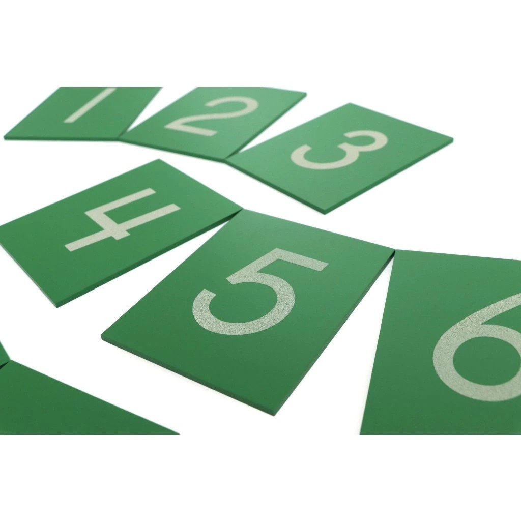 Číslice jsou umístěny na zelených dřevěných destičkách, které jsou typické pro Montessori matematické materiály. Hrubý smirkový povrch vytváří jasný hmatový kontrast a pomáhá dítěti vnímat tvar čísla.