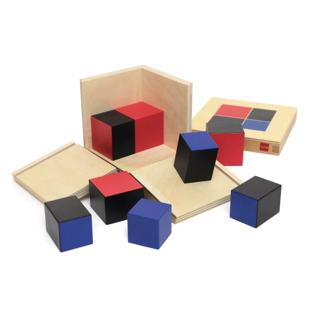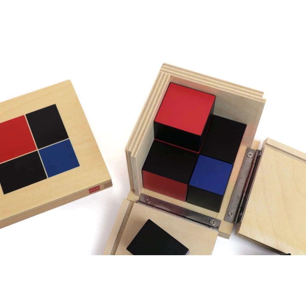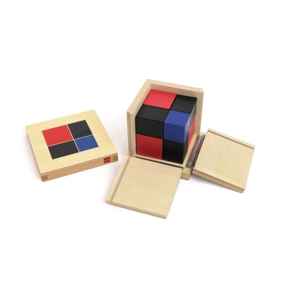 Binomická krychle je klasická Montessori pomůcka, která konkrétně a názorně představuje vztah (a + b)³, aniž by dítě muselo znát matematické vzorce. Dítě pracuje s barevnými dřevěnými krychlemi a hranoly, ze kterých opakovaně skládá dokonalou krychli uloženou v krabičce.