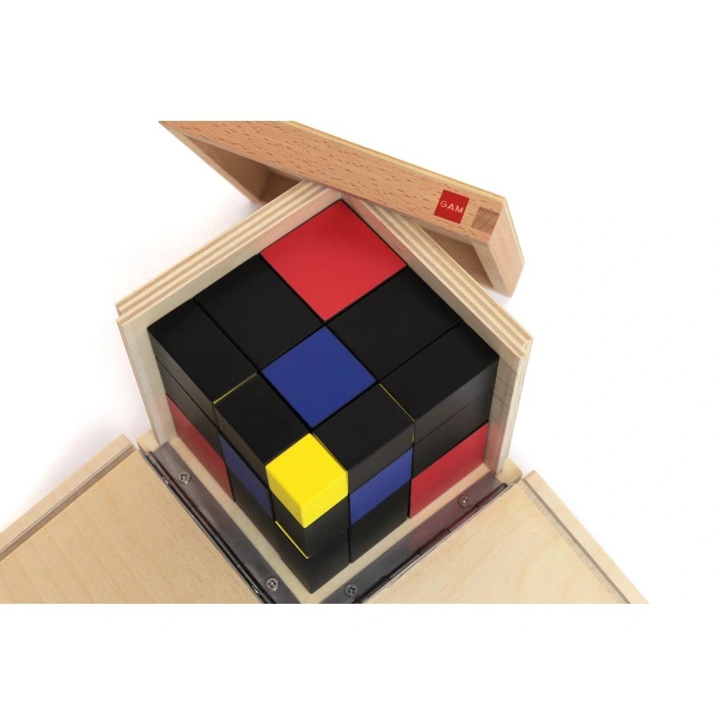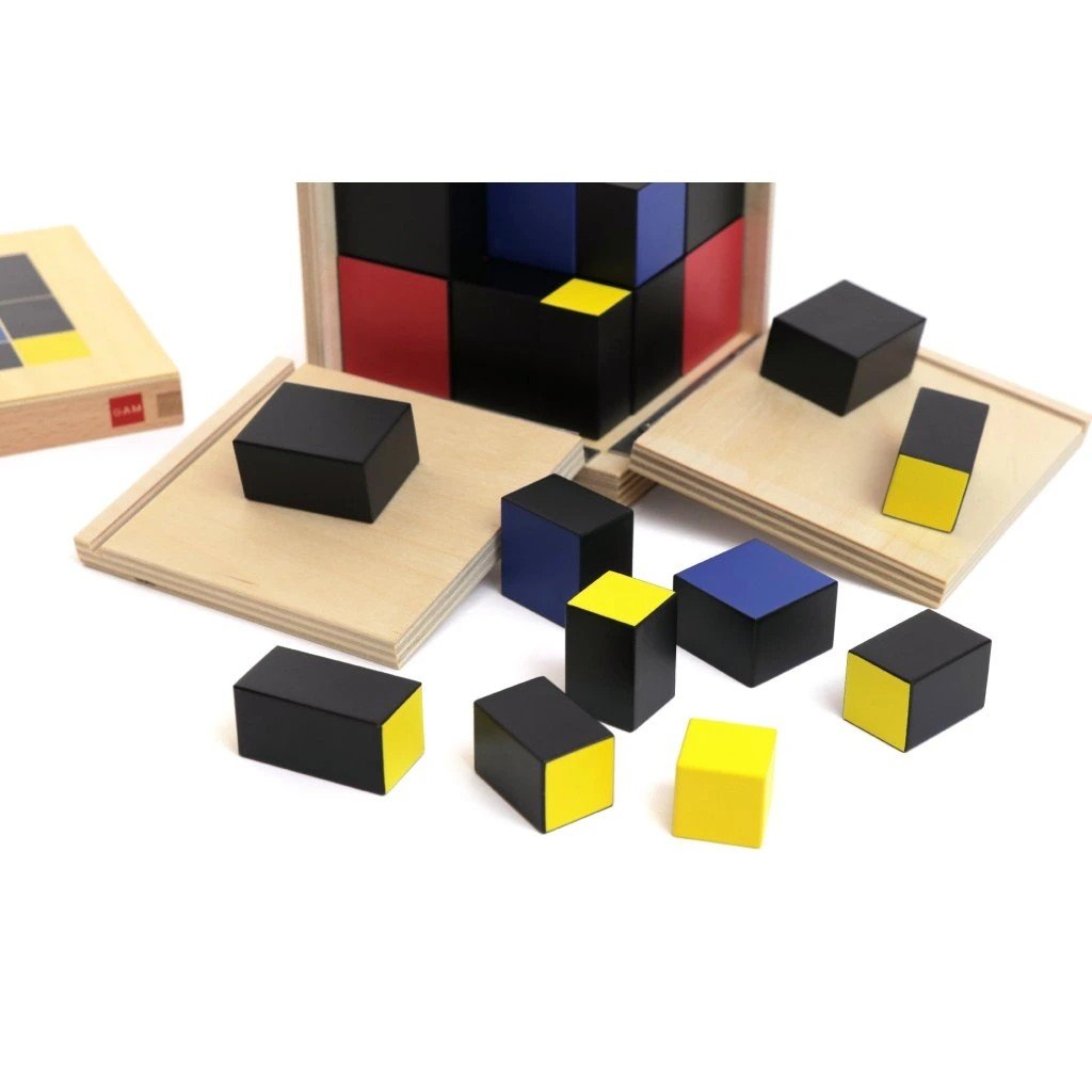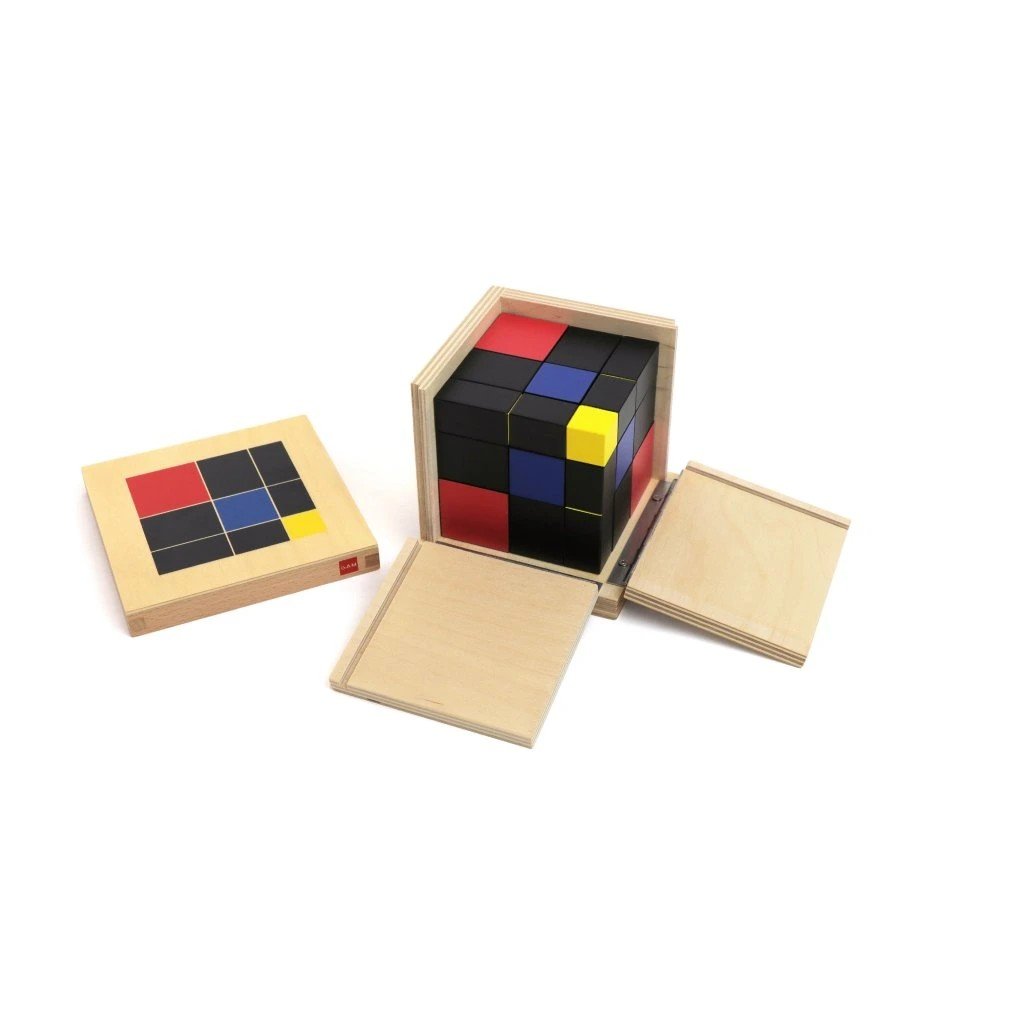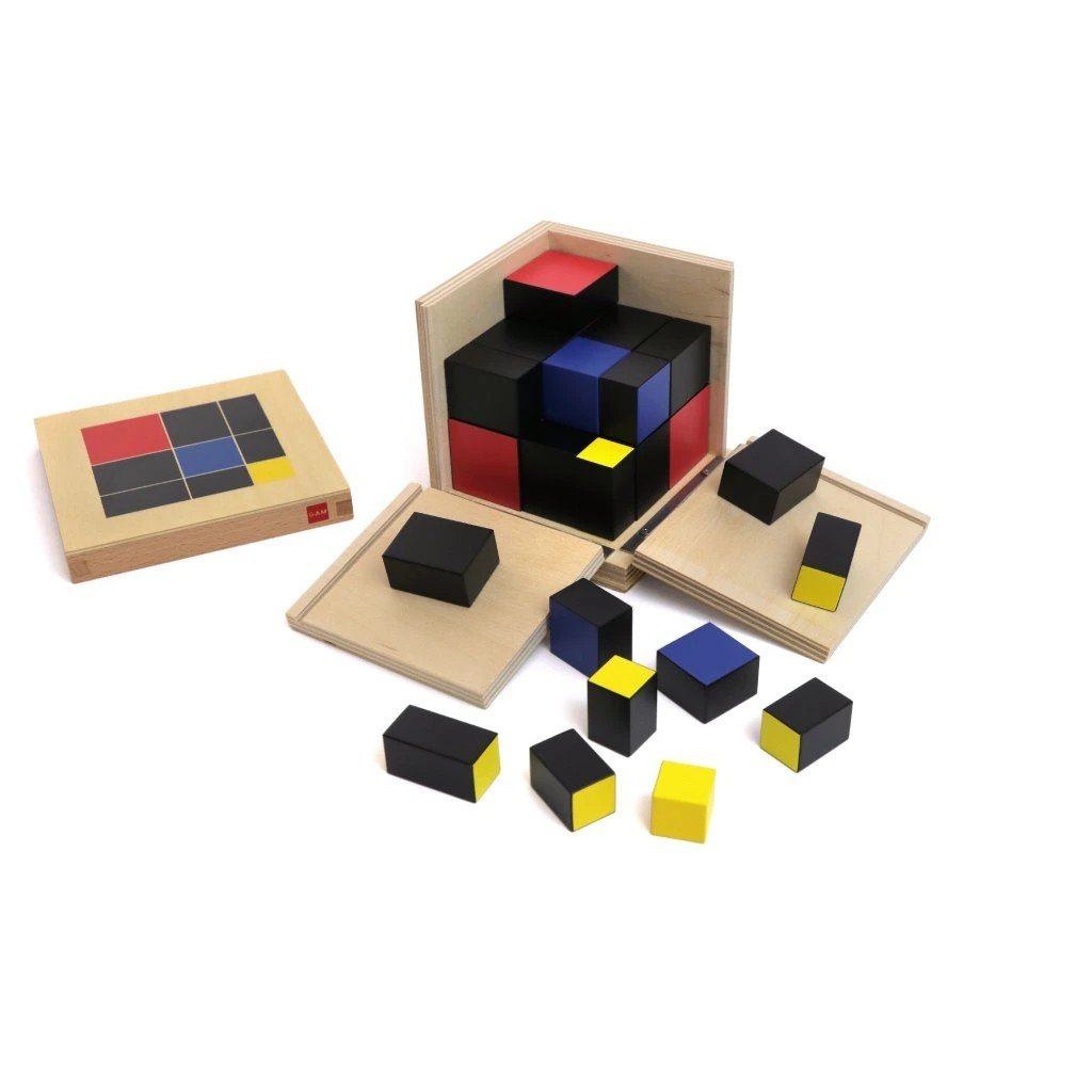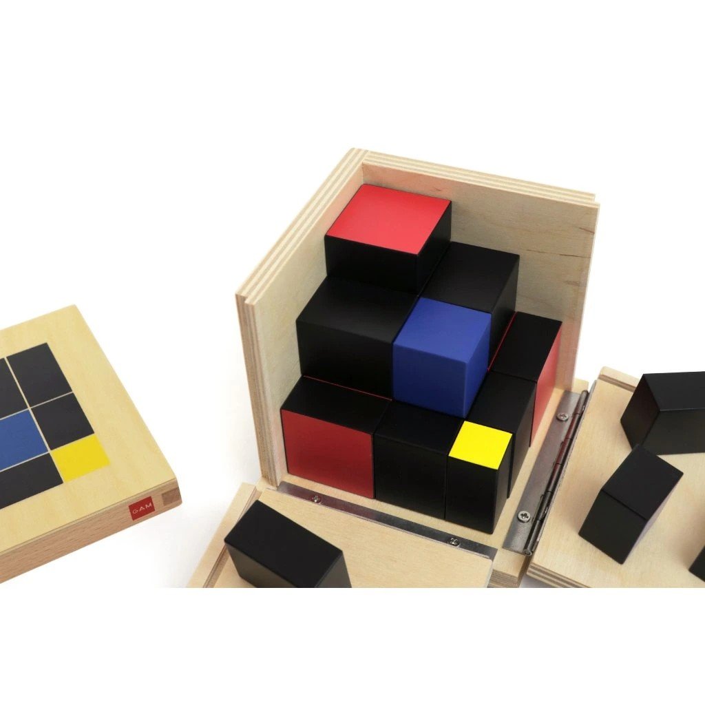 Trinomická krychle je navazující Montessori pomůcka, která konkrétně a názorně představuje vztah (a + b + c)³. Dítě pracuje s barevně rozlišenými dřevěnými krychlemi a hranoly, ze kterých postupně skládá jednu velkou krychli přesně zapadající do krabičky.