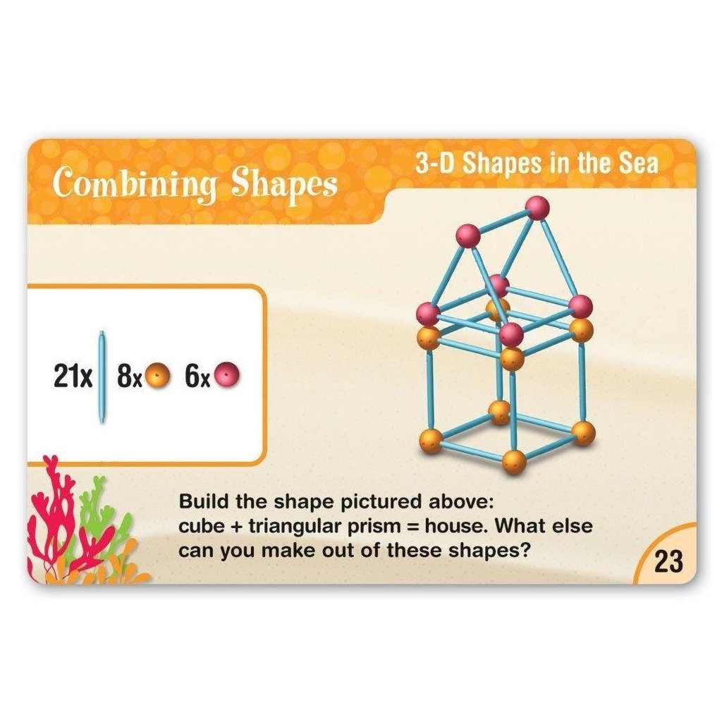 Tato obsáhlá sada obsahuje 150 barevných dílků, se kterými děti mohou tvořit různé geometrické útvary – od jednoduchých 2D tvarů až po složité 3D modely. Dílky jsou snadno spojitelné a motivují děti ke stavění krychlí, trojúhelníků, koule i prostorových objektů podle vlastní fantazie nebo podle předlohy.