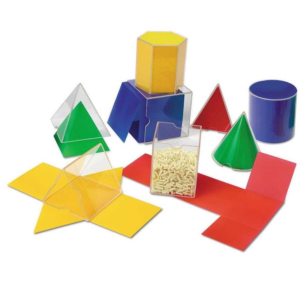 Tato barevná sada poskytuje dětiří konkrétní zkušenost s geometrií – tělesa jsou v reálném měřítku, jejich základny lze odejmout a vyměňovat. Tělesa jsou navržena pro výuku objemu, povrchových ploch, prostorového představování i experimenty s vyplňováním. Transparentní tvrzený plast umožňuje jednoduchou manipulaci a čistý přenos v pomůckách – ideální součást světelného stolu či matematického koutu ve třídě.