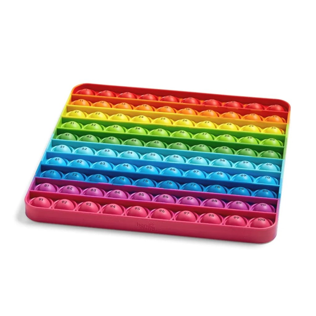 Tato praktická tabulka nabízí silikónové „pop-it“ bublinky označené čísly od 1 do 100. Děti mají možnost bublinky hravě mačkat a znovu nafukovat — ideální pro rozvoj početních znalostí, násobilky i jednoduchých příkladů. Produkt kombinuje hmatový feedback s vizuálním označením, podporuje koncentraci a „learning by doing“ přístup