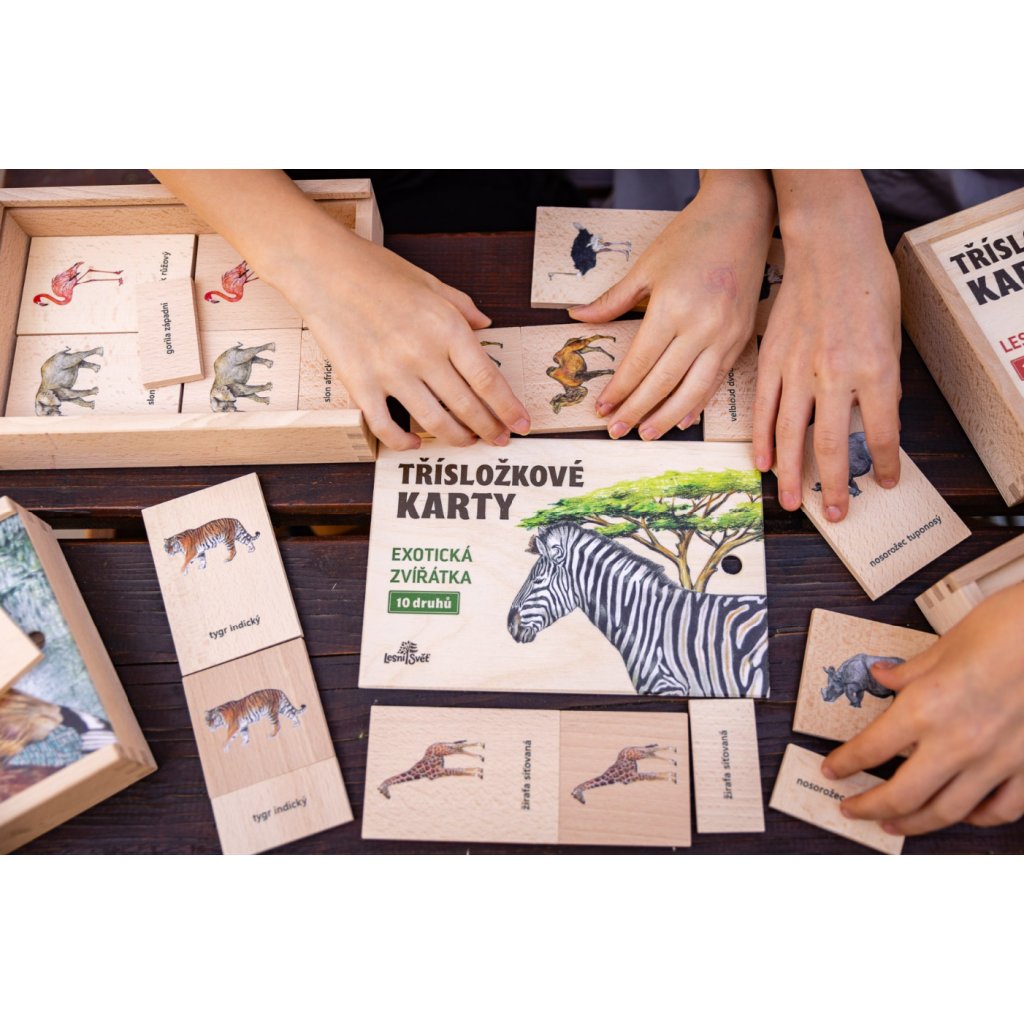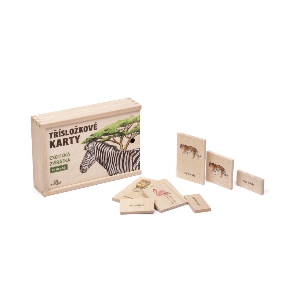 Třísložkové karty vyrábí u nás v dílně české ruce z kvalitního českého certifikovaného dřeva. Balení obsahuje celkem 30 karet-kostiček z masivu ve třech rozměrech: 10 x 6,8 / 6,8 x 6,8 / 6,8 x 3,5 cm (od každého rozměru 10 kostiček). Baleno v dřevěné krabičce z masivu s vysouvacím víkem 23 x 16 x 5,3 cm. Autorem kreseb jsou čeští ilustrátoři, obrázky jsou chráněny autorskými právy. Třísložkové karty zábavnou a hravou formou seznamují děti i dospělé s přírodou. Třísložkové karty slouží k seznámení s názvy a tím rozšiřují slovní zásobu. Názvy zvířat obsahují rodové i druhové jméno. Jedna karta je s obrázkem a názvem, druhá pouze s obrázkem a třetí pouze s názvem. Mladší děti se učí jednotlivá zvířata. Starší děti přiřazují kostky s textem ke kostkám s obrázkem a třetí kostička, na které je obrázek i název, jim slouží ke kontrole. Obsahuje 10 druhů zvířat: tygr indický, pštros dvouprstý, velbloud dvouhrbý, nosorožec tuponosý, lev pustinný, zebra stepní, plameňák růžový, slon africký, gorila západní, žirafa síťovaná. Lesní svět = značka s ekologickým certifikátem udržitelného hospodářství PEFC. Všechny výrobky jsou vyrobeny s ohledem na životní prostředí.