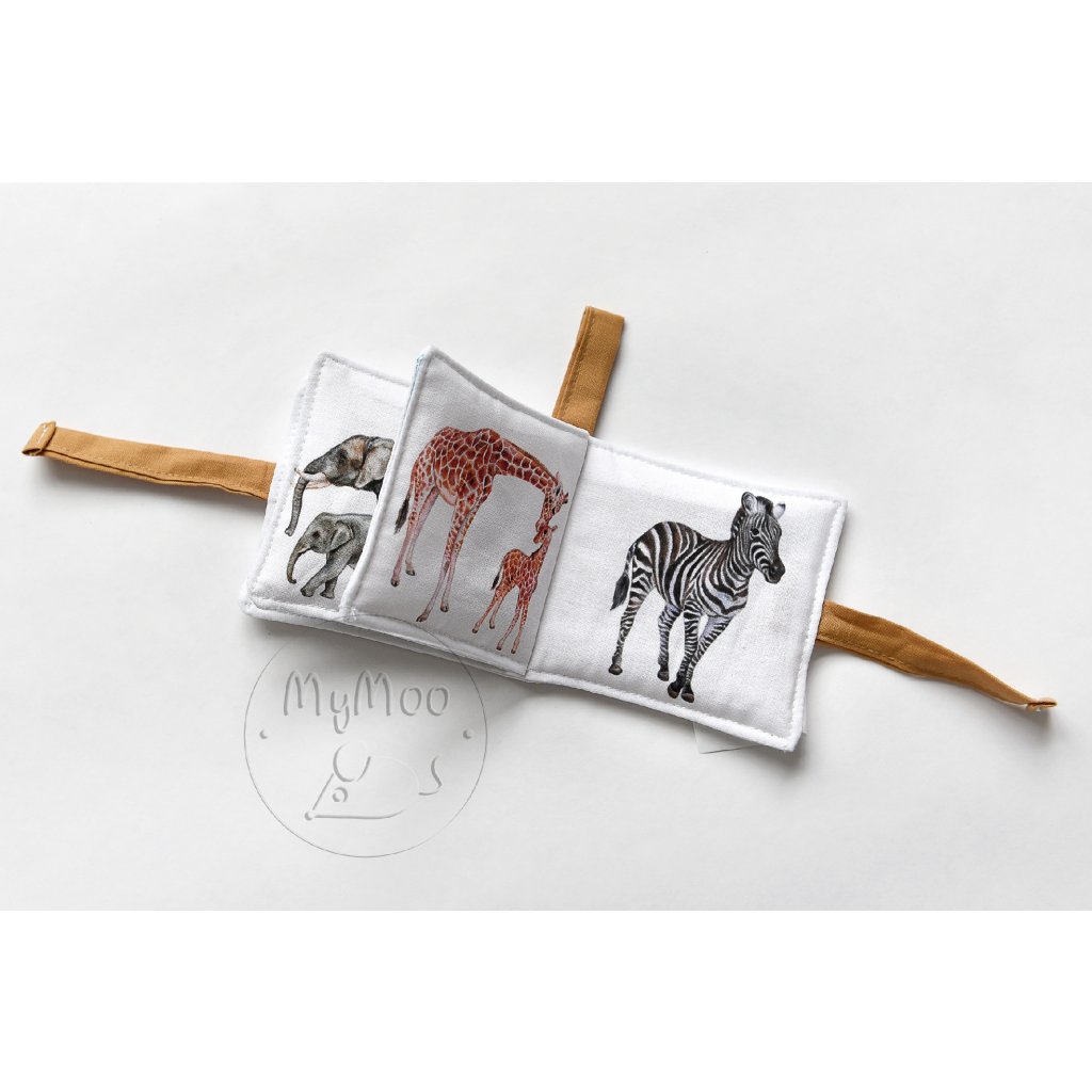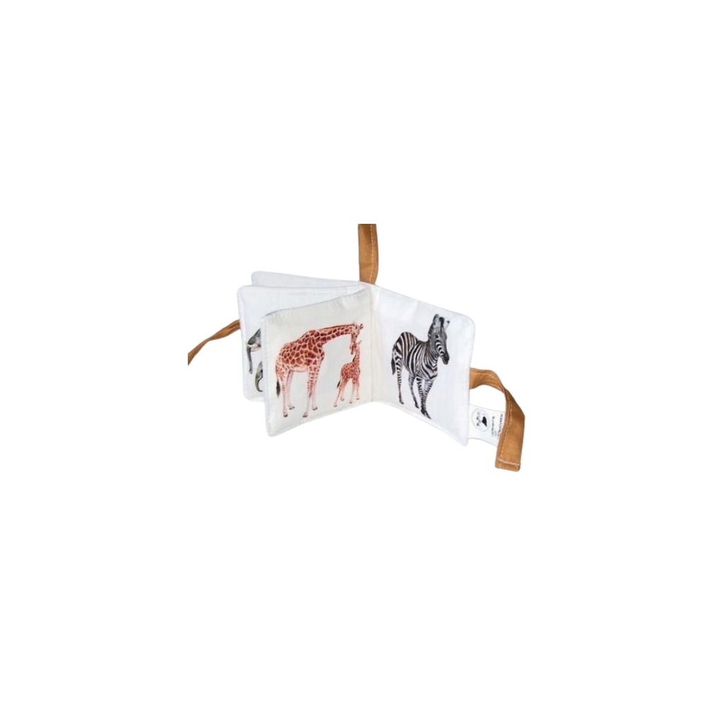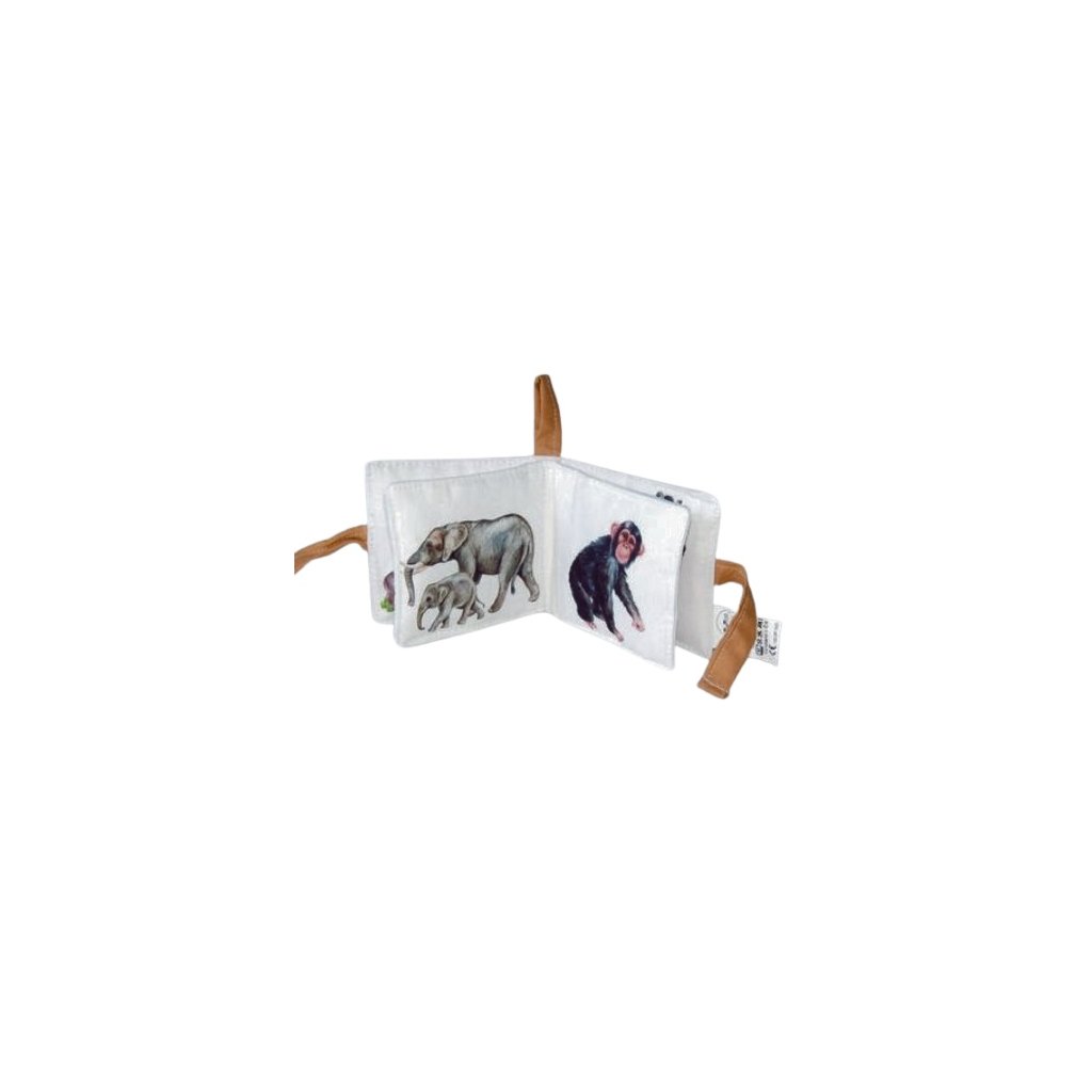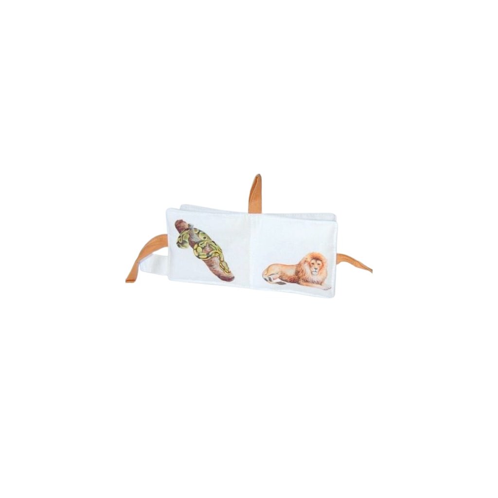 Textilní knížka s nádhernými ilustracemi divokých zvířat Evropy. Obsahuje ilustrace lev, hroch s hrošíkem, krokodýl, slon a slůně, šimpanz, žirafa s mládětem, zebra, krajta. Malá textilní knížka napomůže správné stimulaci mozkových center miminka, ale v tomto případě je skvělým pomocníke pro seznámení batolat s divokovými zvířaty okolo nás. Zrak - využití různých vzorů a geometrických tvarů, které bude děťátko očima fixovat, snažit se zaostřovat zrak a zkoumat. Sluch - jedna ze stran obsahuje rolničku, která upoutá pozornost děťátka a stimuluje sluchové centrum. Hmat - kromě hladkých stran obsahuje úchopové stuhy. Stránka má rozměr 9x9cm. Materiál: 100% bavlna. Výplň: 100% duté vlákno. Ošetřování: Praní v pračce na 40 stupňů, nesušit v sušičce, nebělit, nečistit chemicky.