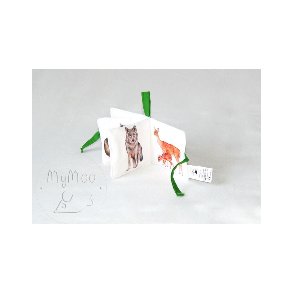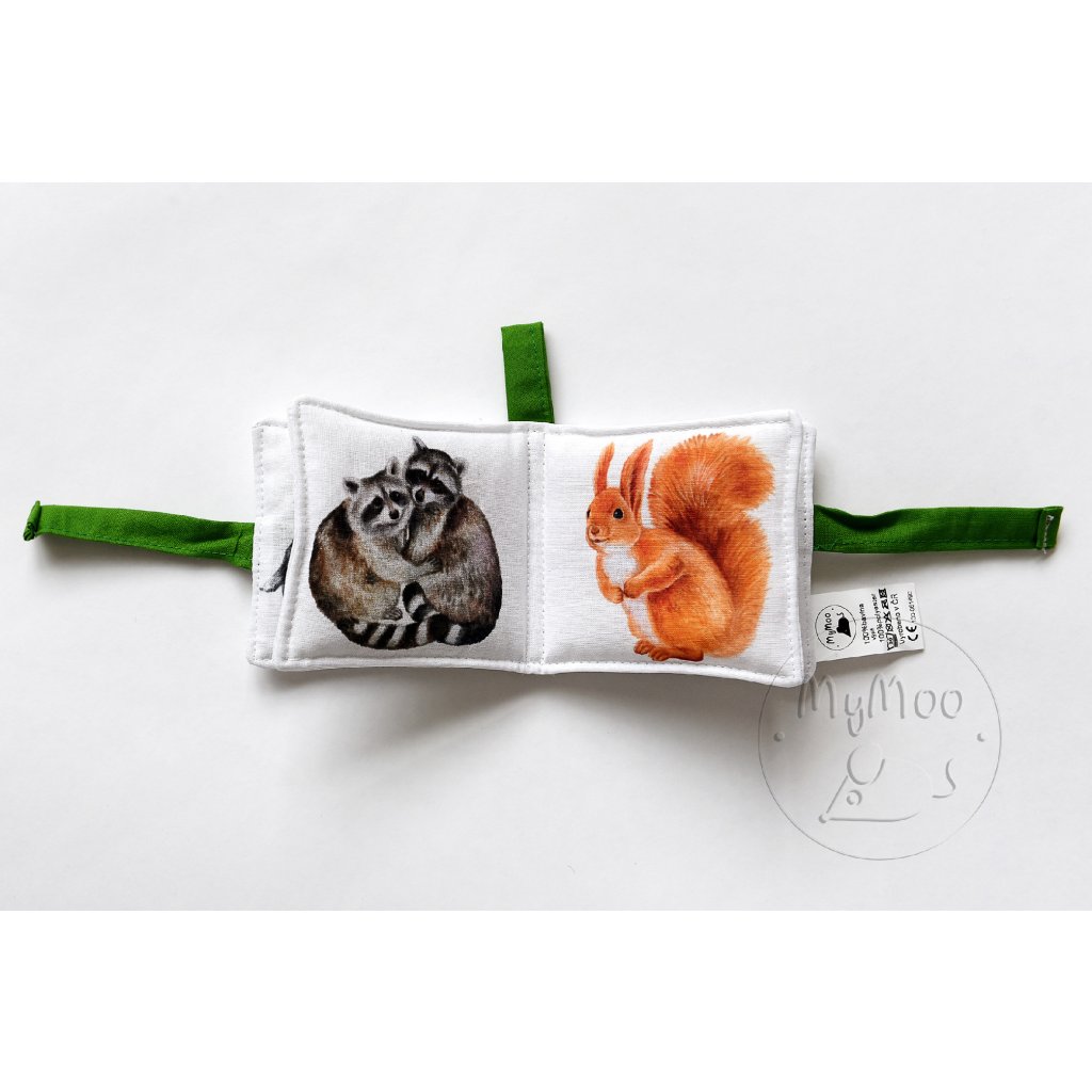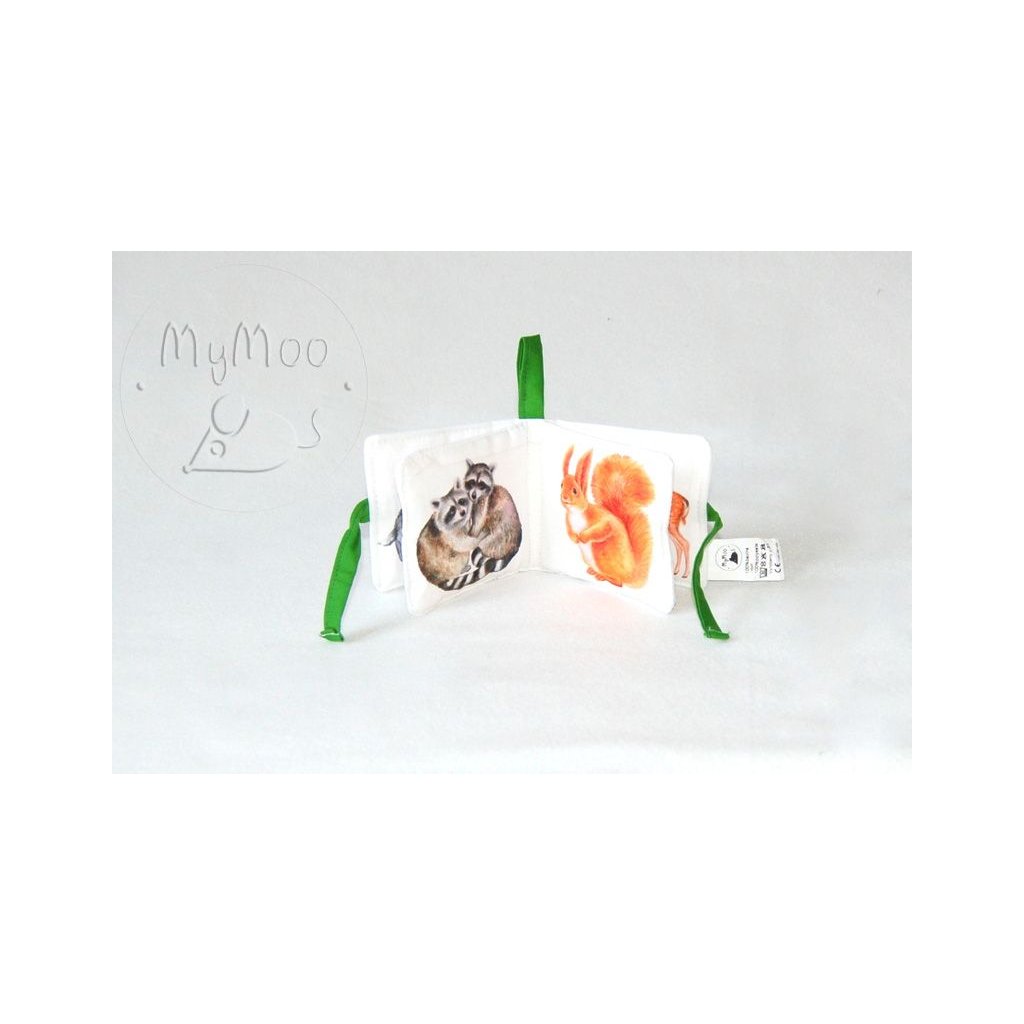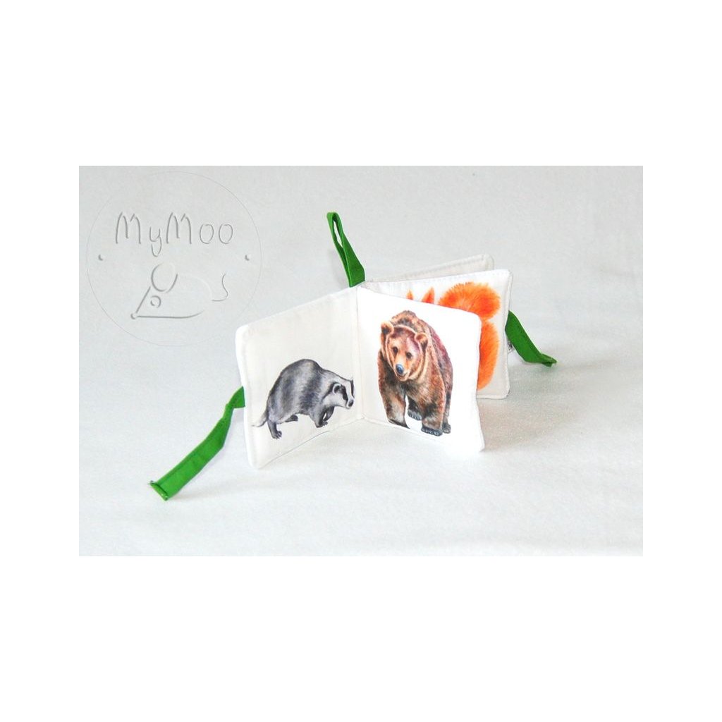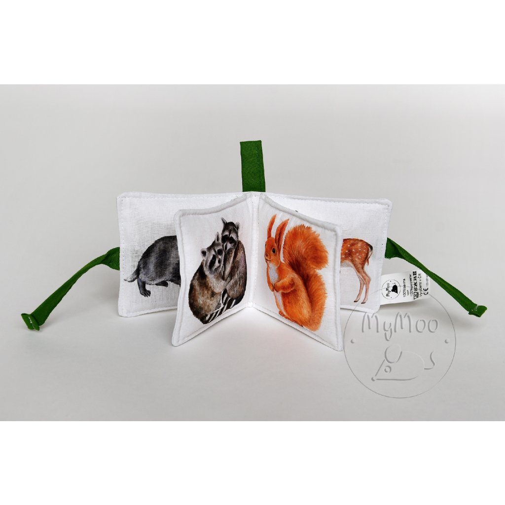 Textilní knížka s nádhernými ilustracemi divokých zvířat Evropy. Obsahuje ilustrace laň s kolouchem, liška, medvěd, mýval, veverka, vlk, ježek, jezevec. Malá textilní knížka napomůže správné stimulaci mozkových center miminka, ale v tomto případě je skvělým pomocníke pro seznámení batolat s divokovými zvířaty okolo nás. Zrak - využití různých vzorů a geometrických tvarů, které bude děťátko očima fixovat, snažit se zaostřovat zrak a zkoumat. Sluch - jedna ze stran obsahuje rolničku, která upoutá pozornost děťátka a stimuluje sluchové centrum. Hmat - kromě hladkých stran obsahuje úchopové stuhy. Stránka má rozměr 9x9cm. Materiál: 100% bavlna. Výplň: 100% duté vlákno. Ošetřování: Praní v pračce na 40 stupňů, nesušit v sušičce, nebělit, nečistit chemicky.
