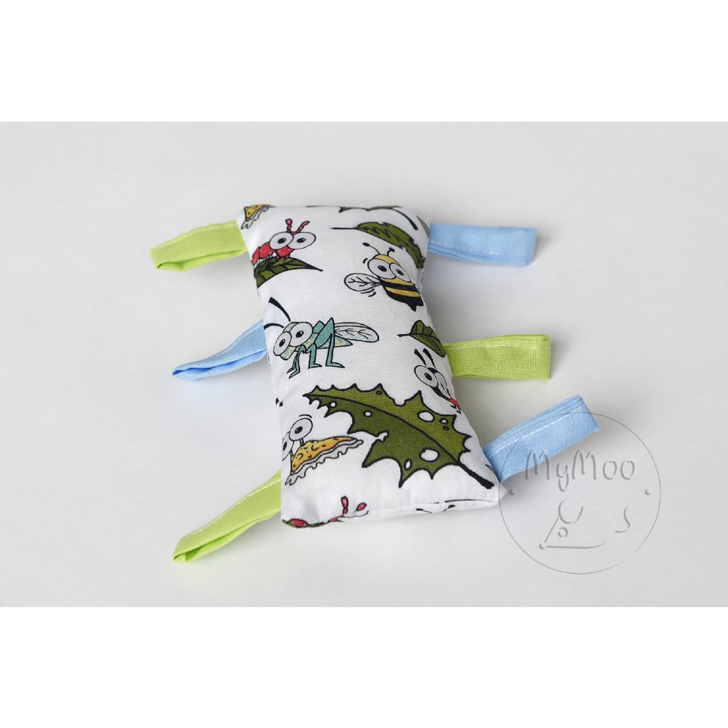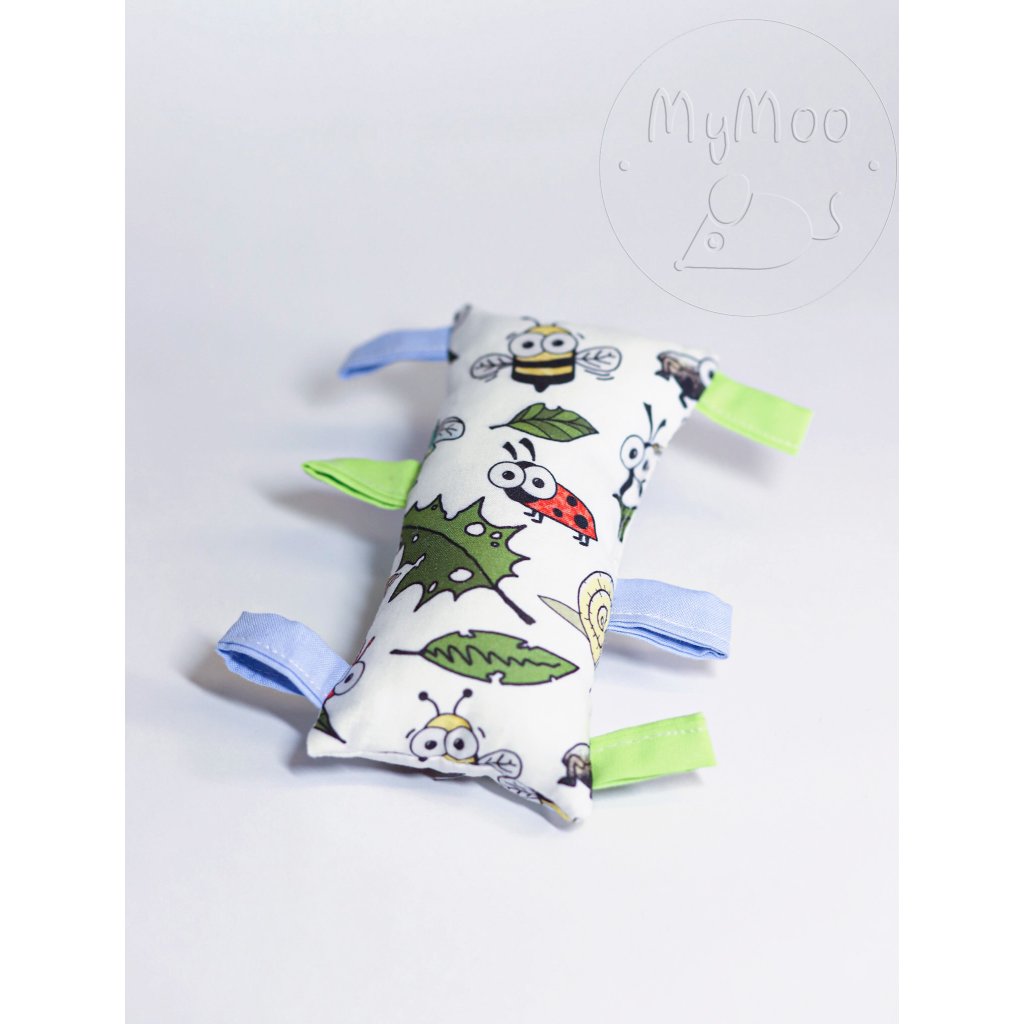 Malý úchopový polštářek ze 100% bavlny lze použít jako zdravější variantu plastového chrastítka. Napomáhá správné stimulaci mozkových center a stimulaci smyslů: zrak - využití různých vzorů a geometrických tvarů, které bude děťátko očima fixovat, snažit se zaostřovat zrak a zkoumat. sluch - většina nepřirozených zvukových efektů působí na citlivý nervový systém děťátka rušivě. Tento polštářek obsahuje jen jemně zvonící rolničku, díky které na sebe polštářek v pohybu upozorní a stimuluje tak sluchové centrum. hmat - střídání hladkých povrchů bavlny na stranách polštářku a vyčnívajících stuh pomáhá stimulovat hmat. Polštářek obsahuje mnoho stužek po obvodu, které slouží na trénink úchopu. Výplň - molitan. Rozměr: 16x8cm. Ošetřování - praní v pračce do max. 40 stupňů, nebělit, nesušit v sušičce, nečistit chemicky.