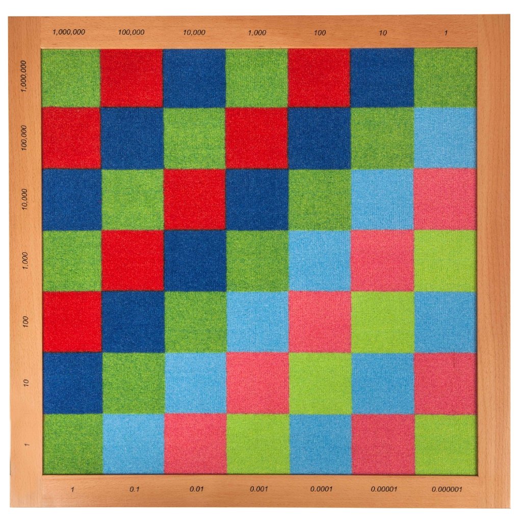 Barevná šachovnice pro desetinná čísla je pokročilá Montessori pomůcka, která slouží k násobení velkých i malých čísel – od milionů po miliontiny. Barevné čtverce usnadňují dětem orientaci v řádech, kde barva odpovídá hierarchii číselných hodnot (zelená – jednotky, modrá – desítky, červená – stovky atd.).