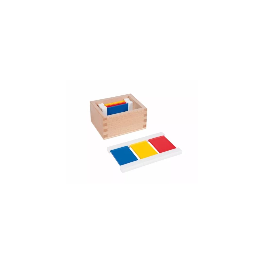 Tato základní sada obsahuje 6 barevných destiček – dvě destičky od každé ze tří základních barev: červená, žlutá, modrá. Dítě se s jejich pomocí učí barvy pojmenovat, porovnávat a spárovat, čímž přirozeně rozvíjí zrakové rozlišování a připravuje se na další práci s barvami v Montessori systému.