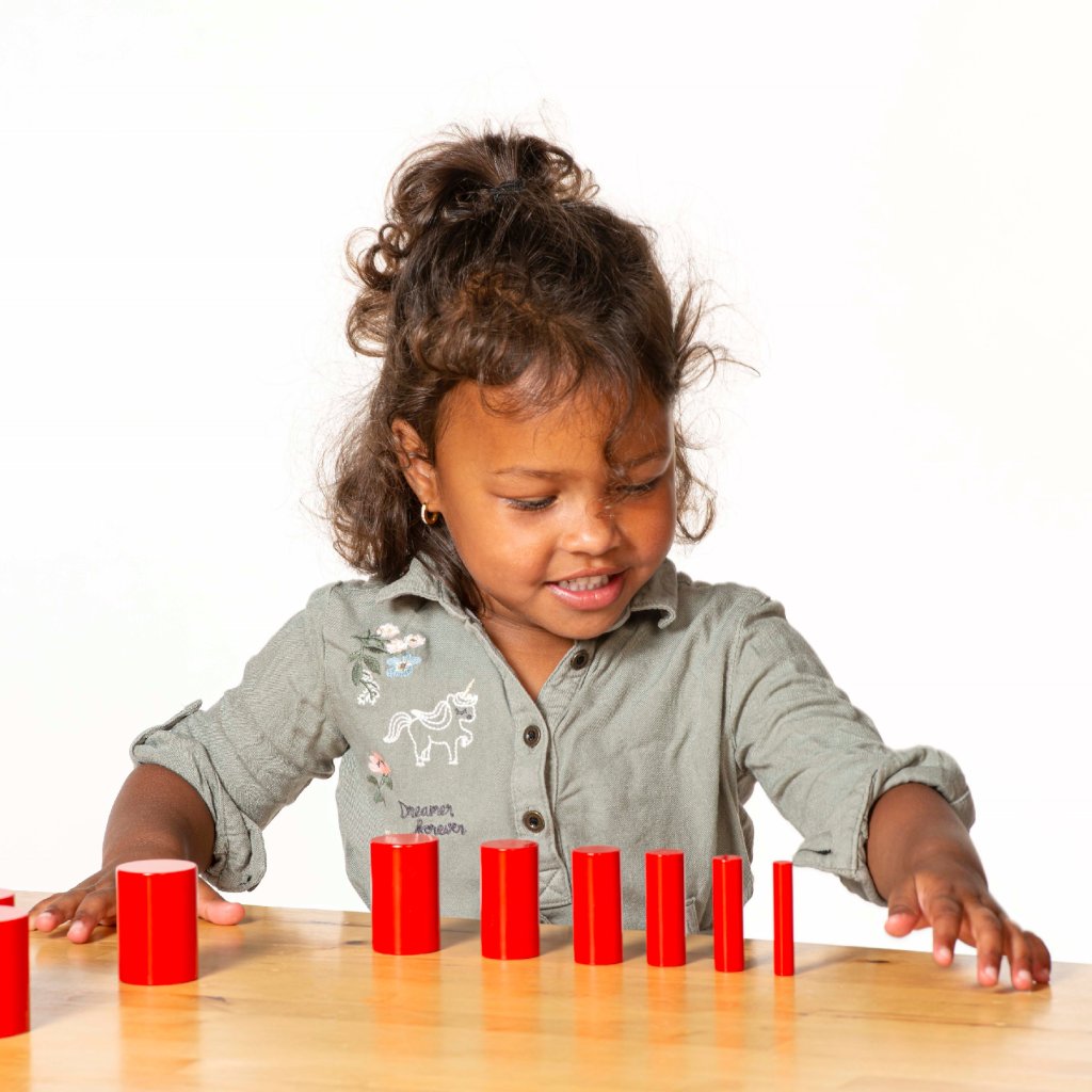 Barevné válečky bez úchytů od Nienhuis Montessori představují závěrečnou fázi práce s rozměrovým materiálem. Jsou navrženy tak, aby dítě na základě předchozích zkušeností samostatně řadilo válečky podle výšky, šířky nebo kombinace obojího.