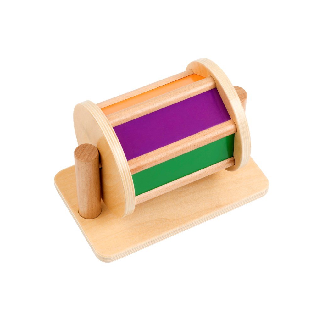 Toto je klasický Montessori materiál pro děti ve věku od 7 měsíců. Materiál se skládá z dřevěného bubnu s několika panely různých jasných barev. Prostřednictvím hry je dítě hypnotizováno krásnými jasnými barvami a fascinováno zvukem, který buben při otáčení vydává. Tyto činnosti pomáhají zdokonalovat zrakový vývoj a jemný uklidňující zvuk, vytvářený při roztočení bubnu, stimuluje tvorbu sluchových smyslů. Zlepšuje se koordinace ruka-oko, stejně jako síla jádra svalů, jemné a hrubé motorické dovednosti a pochopení příčiny a následku. Rozměr produktu 220x160x140 mm. Nizozemská firma Nienhuis Montessori vyrábí montessori pomůcky prémiové kvality a to již od roku 1929.Doplňkové parametry