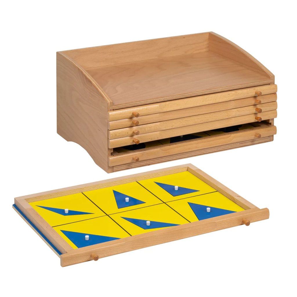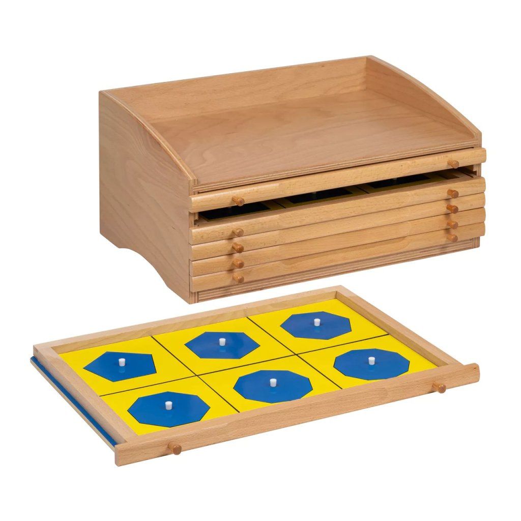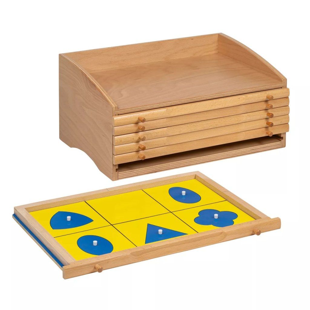 Geometrická komoda je klasická Montessori pomůcka, která dítě seznamuje se světem rovinné geometrie konkrétním a srozumitelným způsobem. V šesti zásuvkách najdete 35 geometrických tvarů s rámečky, se kterými dítě aktivně pracuje – vyjímá je, vrací zpět a postupně si všímá jejich rozdílů i podobností.