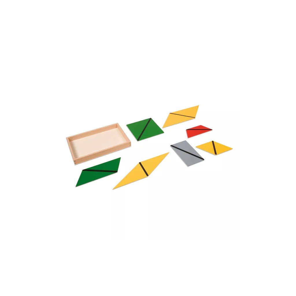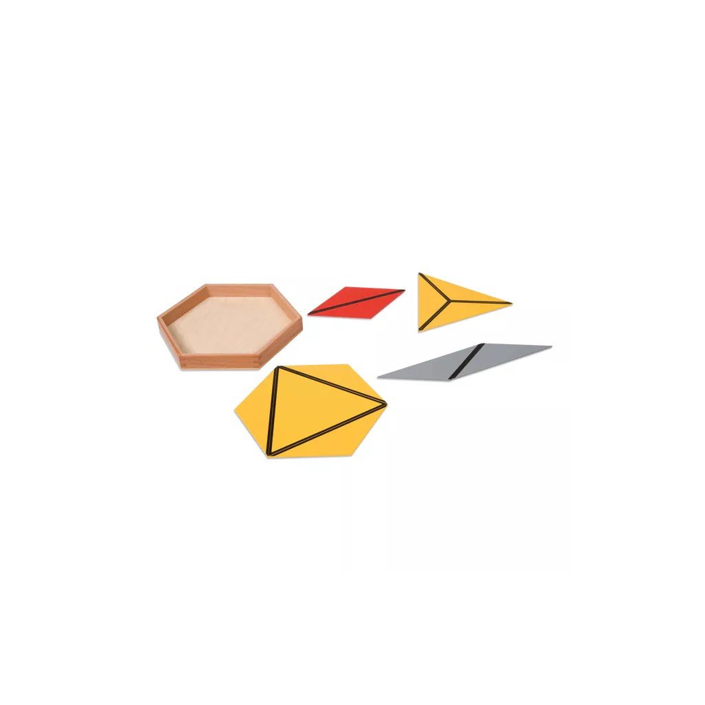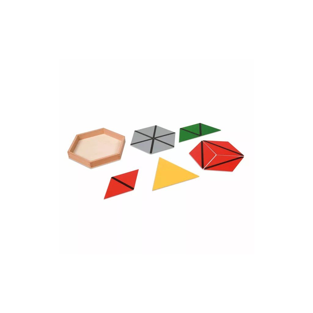 Materiál obsahuje několik sad trojúhelníků různých velikostí, tvarů a barev, které jsou uložené v pěti krabičkách – dvou obdélníkových, jedné trojúhelníkové a dvou šestiúhelníkových. Díky tomu dítě může postupně objevovat různé geometrické vztahy a kombinace tvarů.