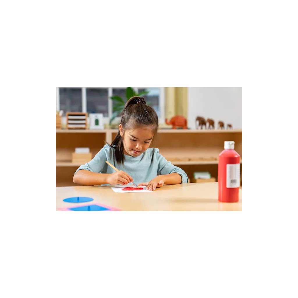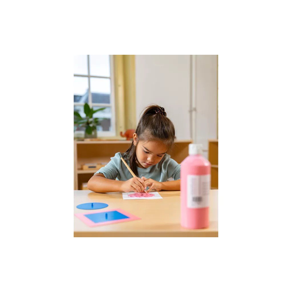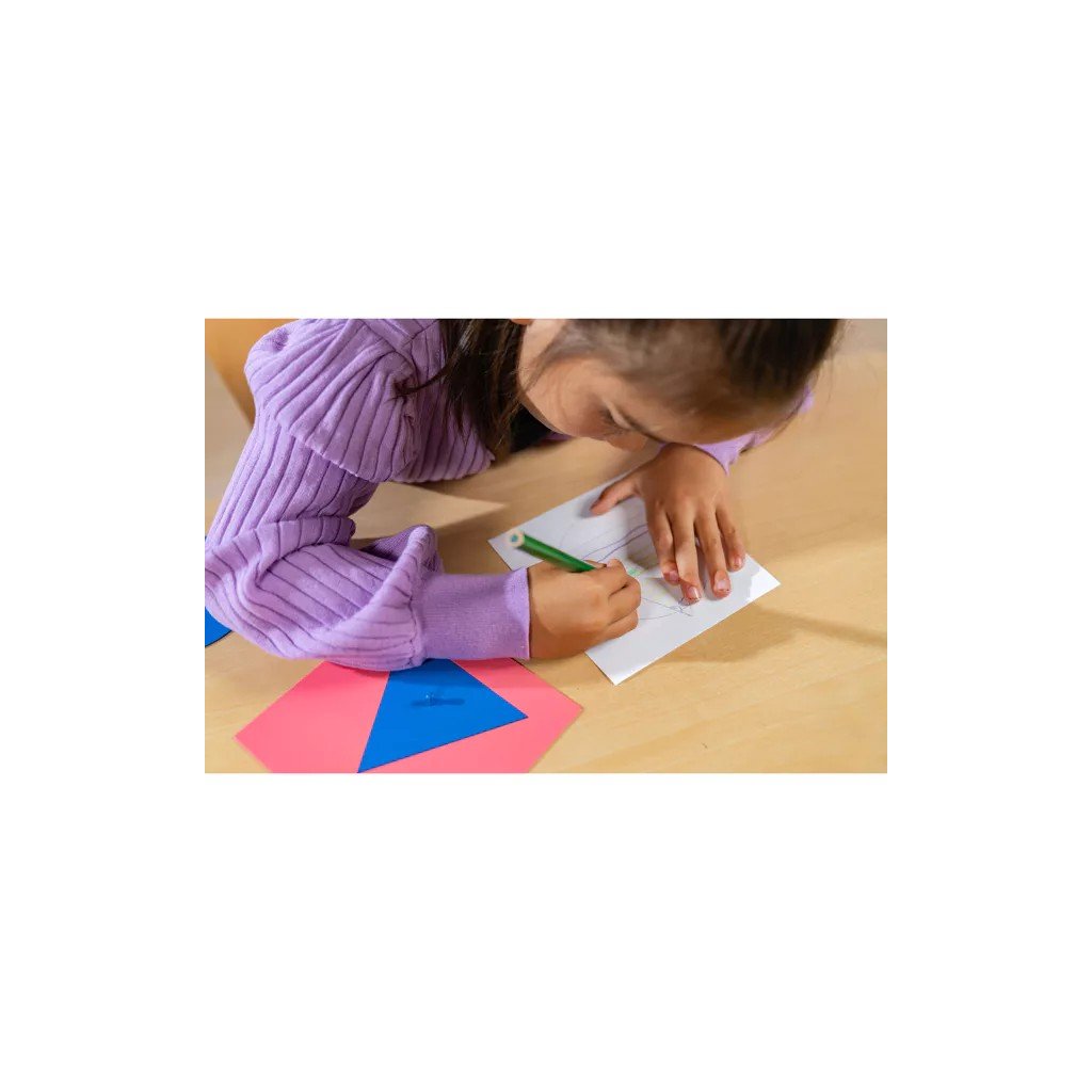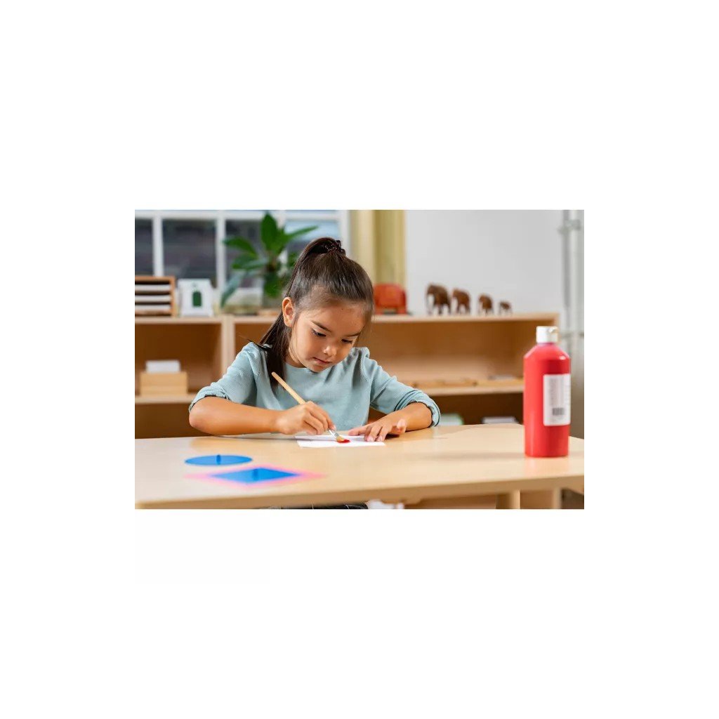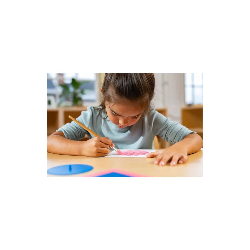 Kovové tvary patří mezi klasické Montessori pomůcky pro přípravu na psaní a rozvoj grafomotoriky. Dítě pracuje s kovovým rámečkem a vloženým tvarem – obkresluje jeho obrys, vybarvuje vzniklé plochy a postupně vytváří vlastní geometrické vzory.