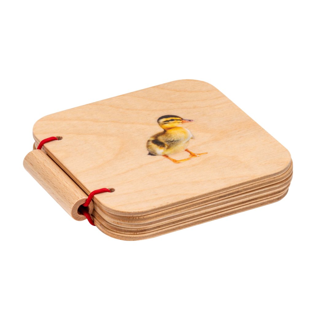 Tato krásná dřevěná knížka byla speciálně navržena pro první čtení s miminky. Obsahuje 8 realisticky zpracovaných obrázků domácích zvířat na pevných dřevěných destičkách, které jsou propojeny pružnou gumou – miminko tak může pohodlně otáčet jednotlivé stránky.