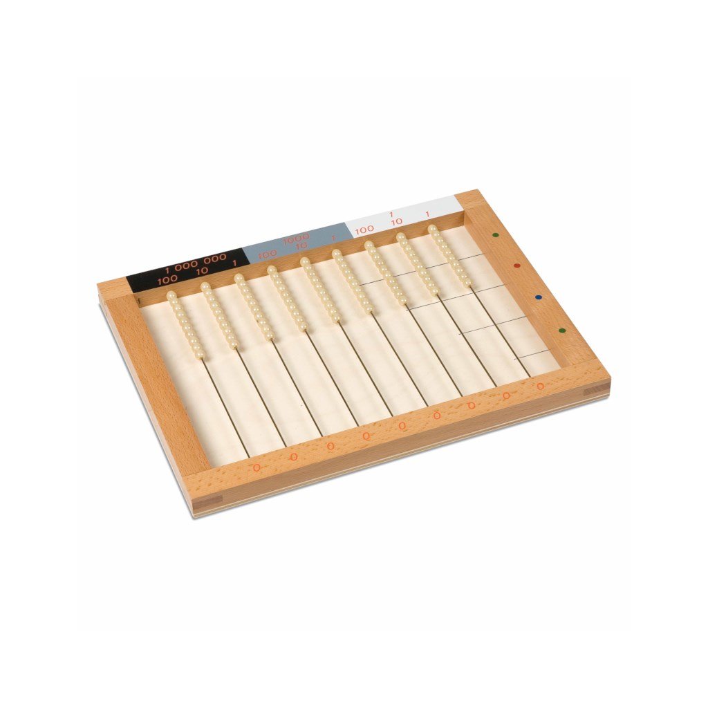 Plochý korálkový rám j posledním krokem na cestě k abstrakci s násobením. Skládá se z rámu z bukového dřeva s 9 sloupci pohyblivých zlatých skleněných korálků. Nizozemská firma Nienhuis Montessori vyrábí montessori pomůcky prémiové kvality a to již od roku 1929.Doplňkové parametry