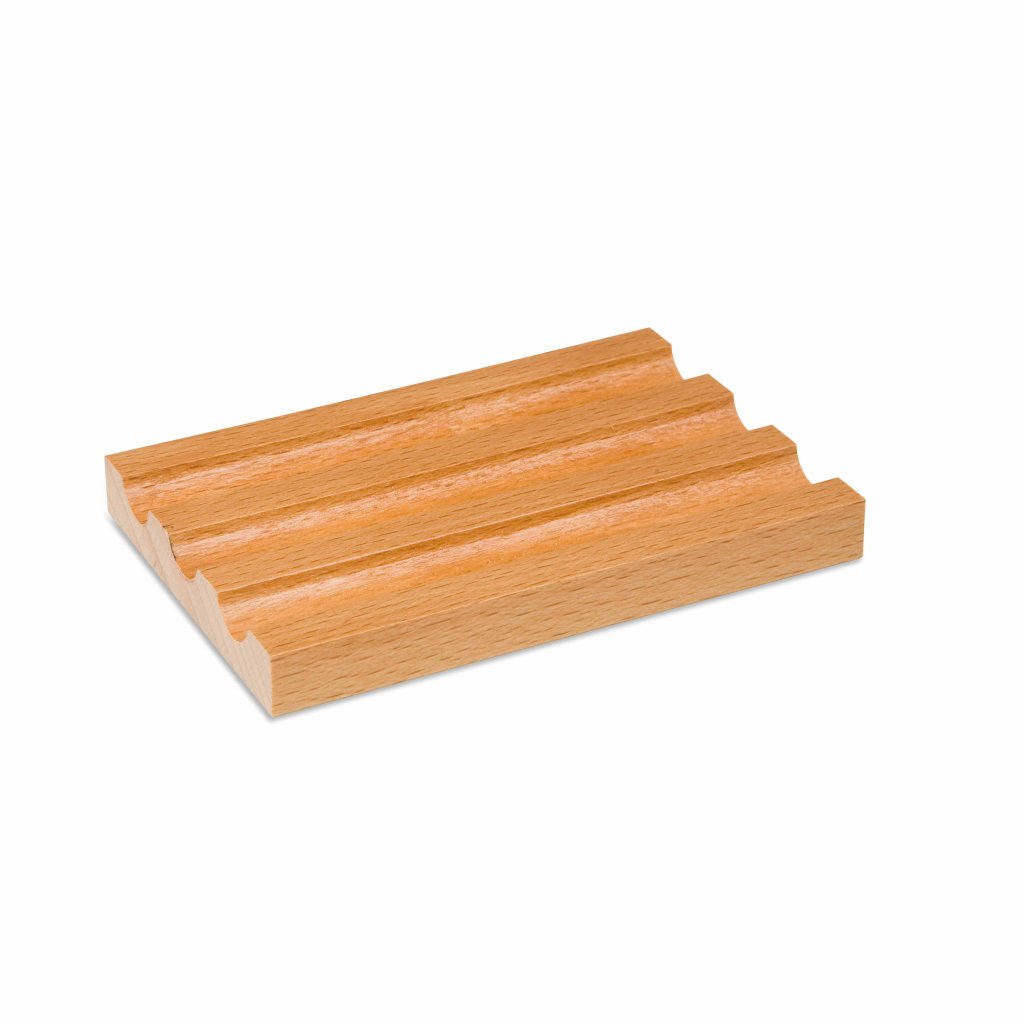 Tento malý dřevěný stojánek slouží k přehlednému uložení tří pastelek nebo tužek, které děti používají při práci s Montessori kovovými tvary. Díky třem drážkám mají psací potřeby své místo a jsou vždy připravené k použití.